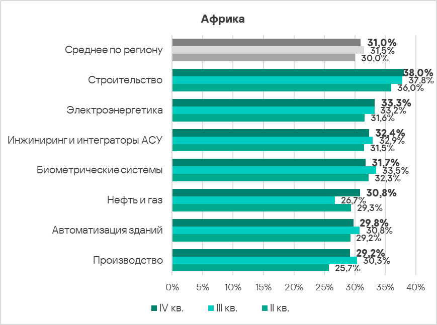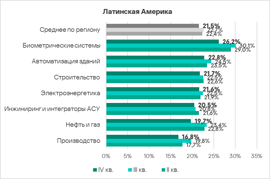 В регионах этой группы компьютеры в технологических сетях особенно подвержены киберугрозам. Характерной проблемой для этих регионов является недостаточный уровень инвестиций в кибербезопасность. Это касается как внедрения защитных инструментов и мер, так и решения проблем нехватки специалистов, формирования культуры кибербезопасности и повышения осведомленности. |