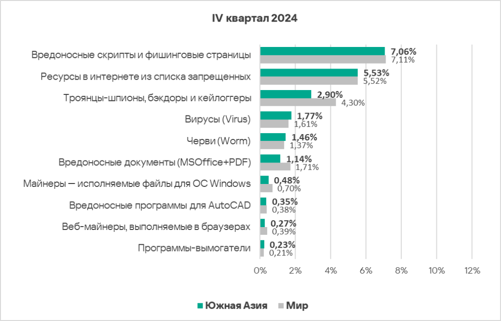 - По сравнению со среднемировыми показателями в регионе выше доля компьютеров АСУ, на которых были заблокированы майнеры — исполняемые файлы для ОС Windows. Это значение превышает среднемировое в 1,5 раза (также оно выше значения за третий квартал 2024 года), это второе место в мире.
