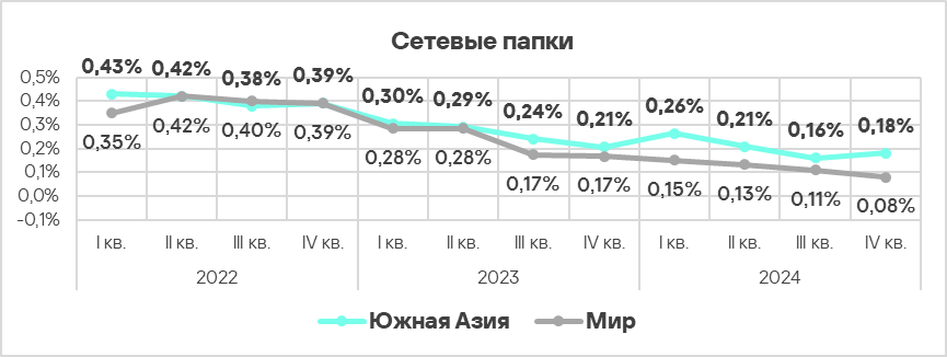 Высокие показатели обнаружения самораспространяющегося вредоносного ПО и ПО, которое распространяется через сетевые папки, на уровне отрасли, страны или региона, вероятно, указывают на наличие незащищенной технологической инфраструктуры, в которой отсутствует даже базовая защита конечных устройств.