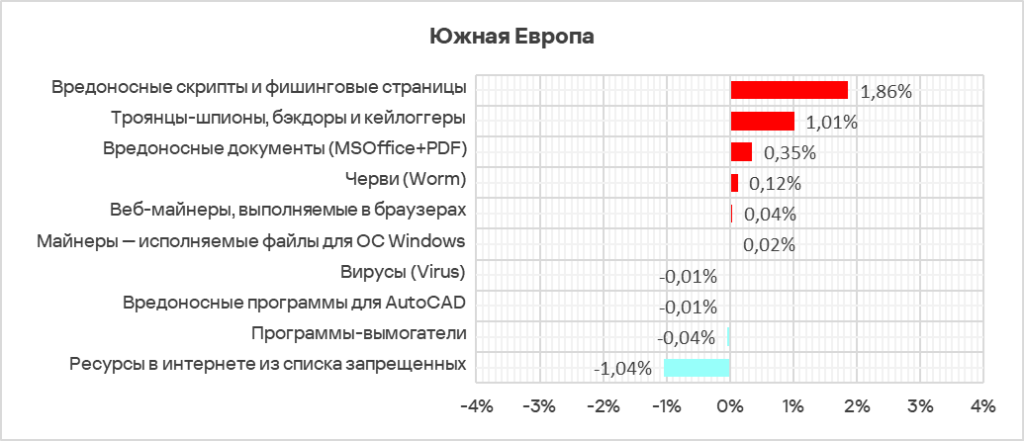 - Южная Европа делит с Южной Азией восьмое место в рейтинге регионов по доле компьютеров АСУ, на которых были заблокированы вредоносные объекты.