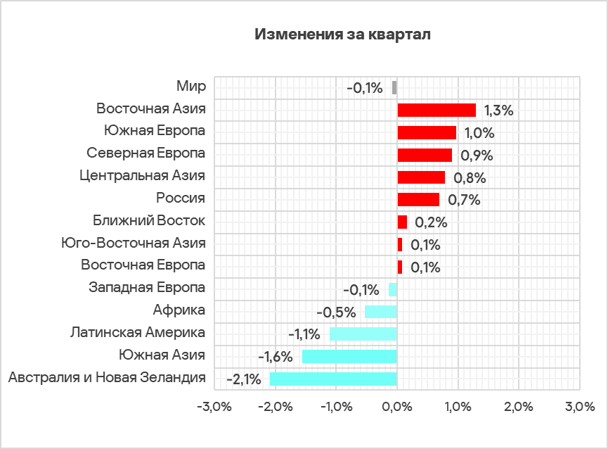 - Наибольший прирост в процентах за квартал отмечен у доли компьютеров АСУ, на которых были заблокированы программы-вымогатели — в 2,3 раза. По росту этого показателя регион занимает первое место в мире.