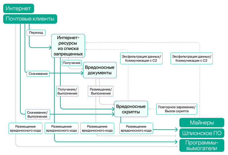 Вредоносные объекты, которые используются для первичного заражения компьютеров, доставляют на компьютеры жертв вредоносное ПО следующего этапа: шпионское ПО, программы-вымогатели и майнеры.