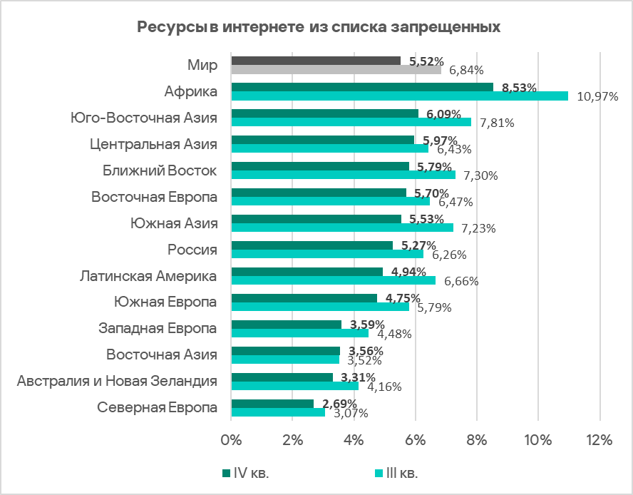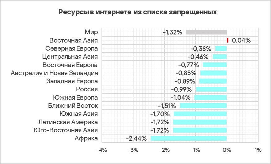 Во всех регионах, за исключением Восточной Азии, наблюдалось снижение доли компьютеров АСУ, на которых были заблокированы интернет-ресурсы из списка запрещенных.