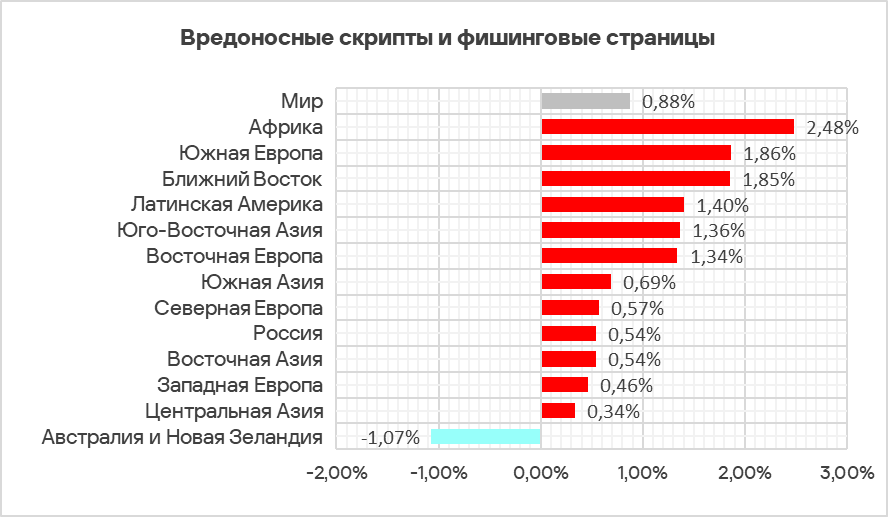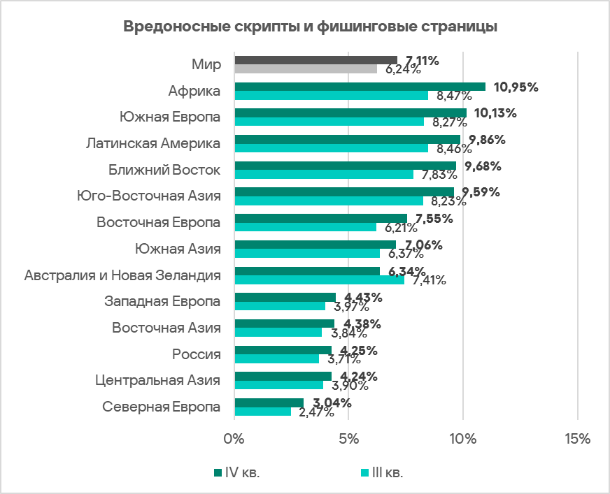 Топ 3 регионов по доле компьютеров АСУ, на которых были заблокированы вредоносные скрипты и фишинговые страницы: Африка, Южная Европа и Латинская Америка.