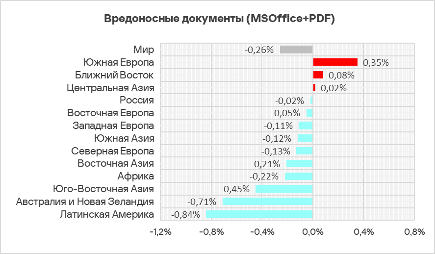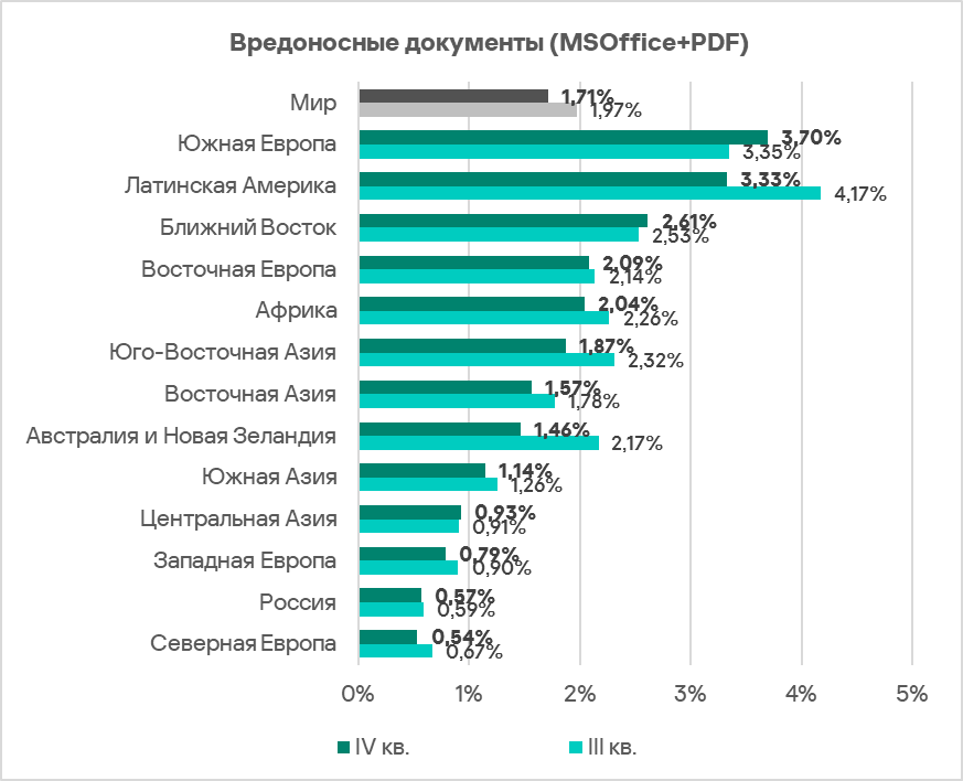 Топ 3 регионов по доле компьютеров АСУ, на которых были заблокированы вредоносные документы: Южная Европа, Латинская Америка и Ближний Восток.