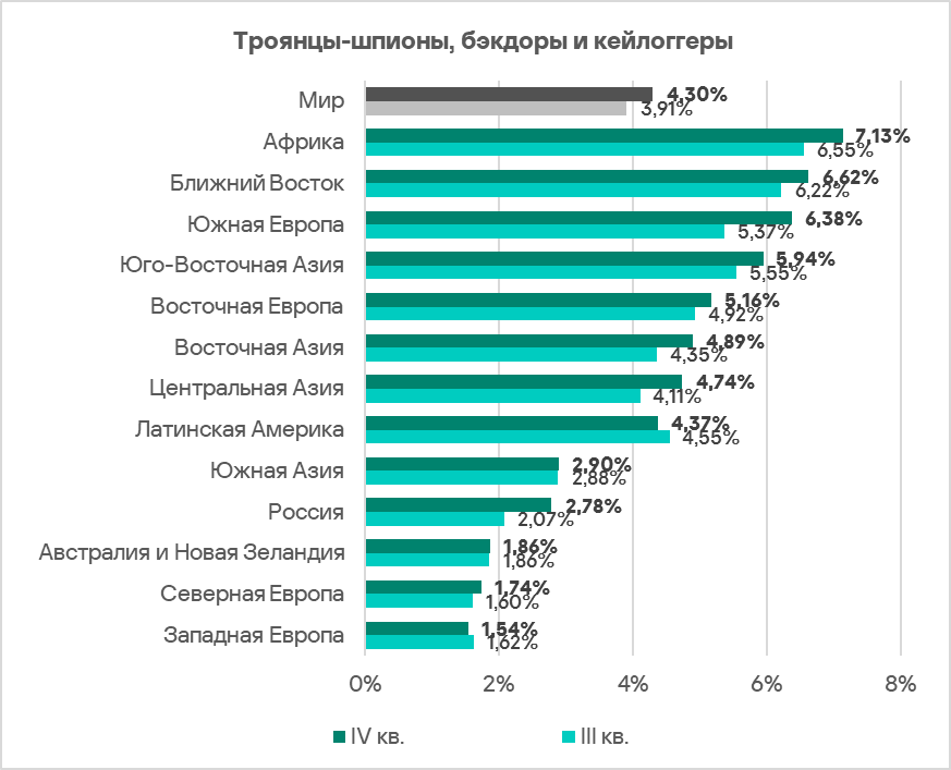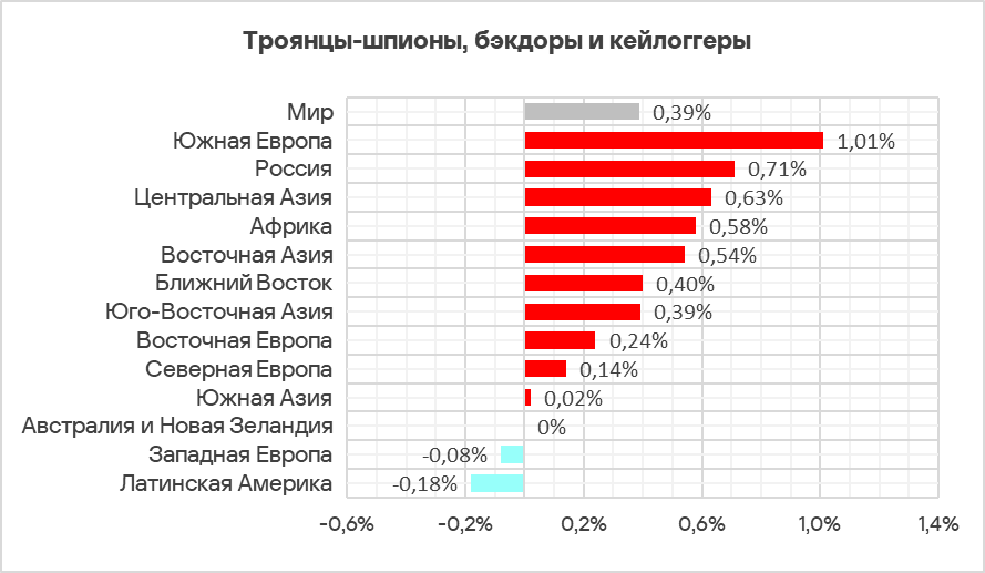 - Ближний Восток, Южная Европа и Центральная Азия — в этих регионах шпионские программы находятся на втором месте в соответствующих рейтингах.