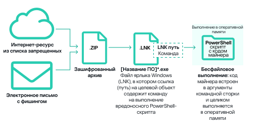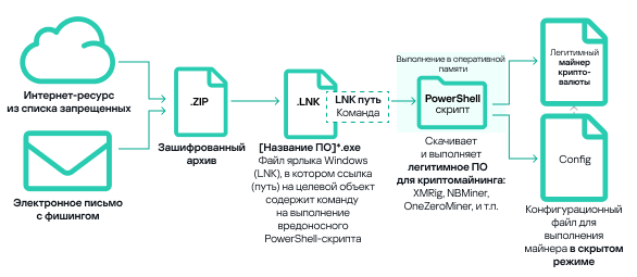 Значительная часть майнеров для ОС Windows, обнаруженных на компьютерах АСУ в четвертом квартале 2024 года, точно так же, как и кварталом ранее, представляла собой архивы с именами, имитирующими легальное программное обеспечение. В этих архивах не было ПО как такового, но содержался файл ярлыка Windows (LNK). Однако целевой объект (или путь), на который указывает LNK-файл, не является обычным приложением, а представляет собой команду, которая может выполнить вредоносный код, например, скрипт PowerShell. В последнее время злоумышленники все чаще используют PowerShell для выполнения вредоносного кода, включая майнеры, передавая вредоносный код непосредственно в аргументах командной строки. Передаваемый код целиком выполняется в оперативной памяти, обеспечивая бесфайловое выполнение майнера и делая проблематичным его обнаружение средствами защиты.