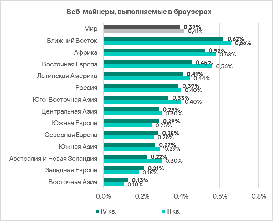 Топ 3 регионов по доле компьютеров АСУ, на которых были заблокированы веб-майнеры, выполняемые в браузерах: Ближний Восток, Африка и Восточная Европа.