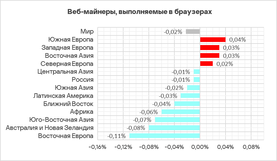 В Австралии и Новой Зеландии, а также Западной Европе веб-майнеры занимают более высокую позицию по доле компьютеров АСУ, на которых они были заблокированы, чем в мировом рейтинге — шестое место в регионе против восьмого в мире.