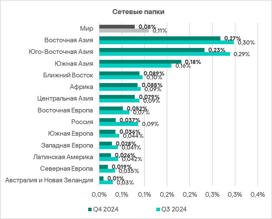 Топ 3 регионов по доле компьютеров АСУ, на которых в четвертом квартале 2024 года были заблокированы угрозы из интернета: Африка, Юго-Восточная Азия и Ближний Восток.