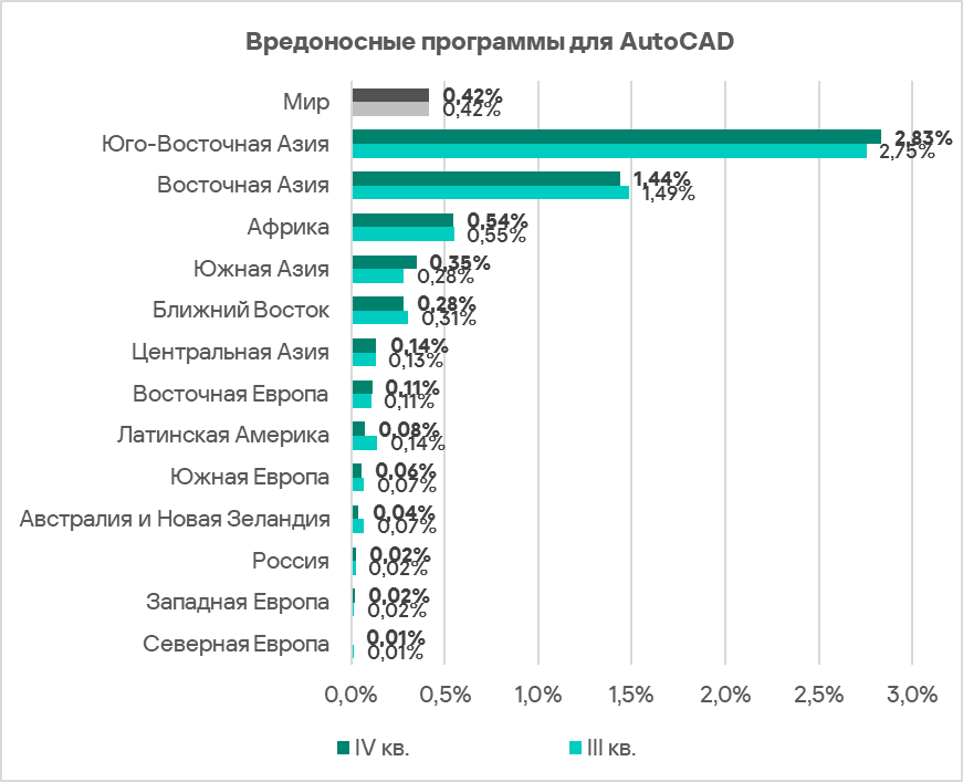 По доле компьютеров АСУ, на которых были заблокированы вредоносные программы для AutoCAD, лидируют те же регионы, что и в рейтинге по вирусам. Это Юго-Восточная Азия, Восточная Азия и Африка.