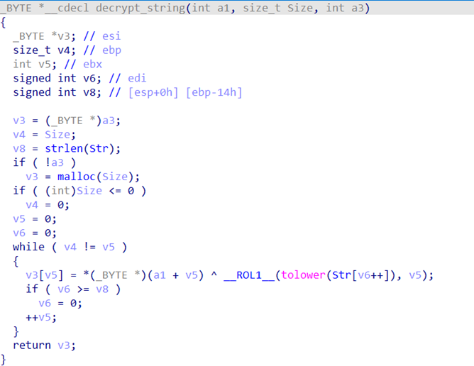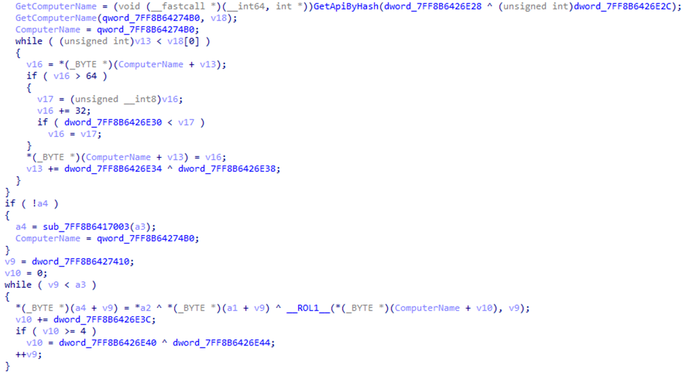 Злоумышленники использовали собственный обфускатор программного кода, который вычисляет хеш имени системы (как упоминалось ранее, за исключением этапа первоначального заражения) и сравнивает его со значением, переданным DNSCat2 через аргументы командной строки. Если значения не совпадают, выполнение вредоносного кода прекращается. Это не новая техника, но ее реализация в данном случае заслуживает внимания, так как значение хеша используется не только как условие верификации, но и в качестве ключа расшифровки строк вредоносной программы, включая имена динамически импортируемых API-функций.