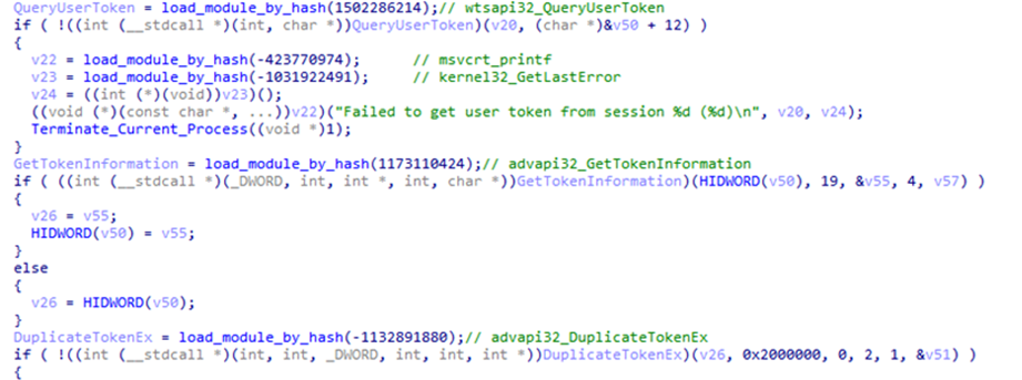 Если в аргументах командной строки не указан идентификатор пользователя, вредоносная программа получает список активных RDP-сеансов, извлекает информацию о подключенных к системе пользователях и получает соответствующие идентификаторы сеансов. Поскольку администраторы часто подключаются к системам удаленно через RDP для выполнения настроек, вредоносное ПО может получить информацию о сеансе привилегированного пользователя.