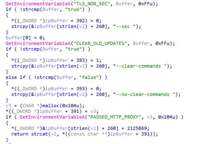 Полученные настройки заносятся в переменные окружения, с которыми в дальнейшем работает вредоносная программа:
