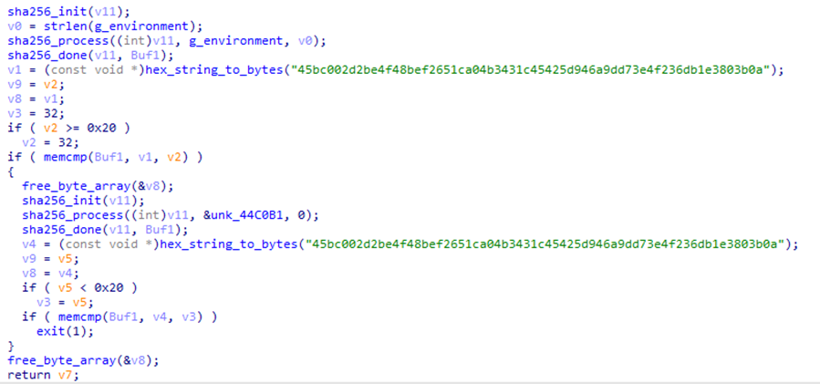 Злоумышленники предусмотрели механизм, позволяющий запускать вредоносную программу только на целевых системах: для имени зараженной машины вычисляется значение хеш-функции SHA256 (с использованием «соли»), и результат сравнивается с заданным в код программы значением. Если значения не совпадают, выполнение программы прекращается.