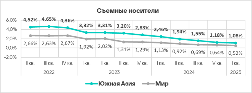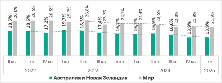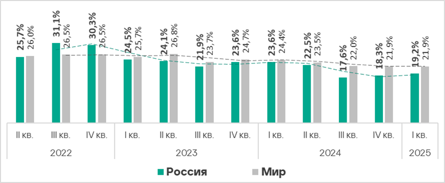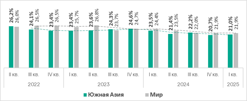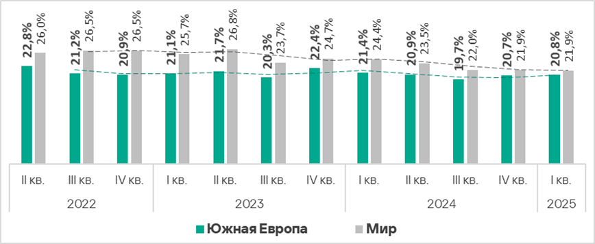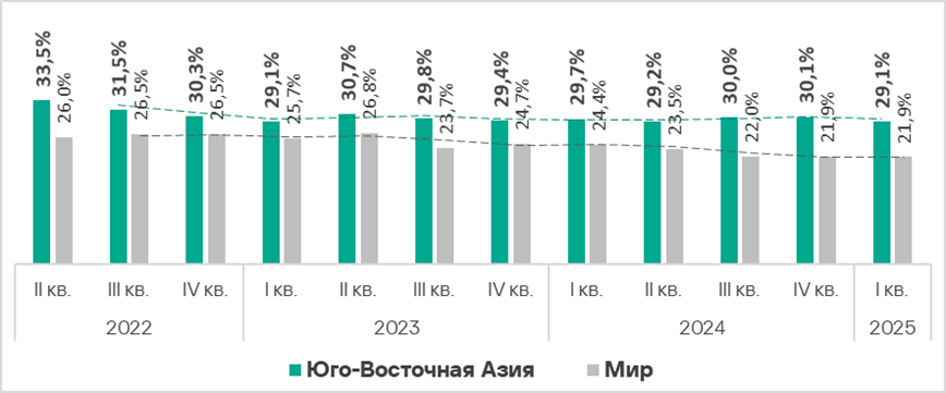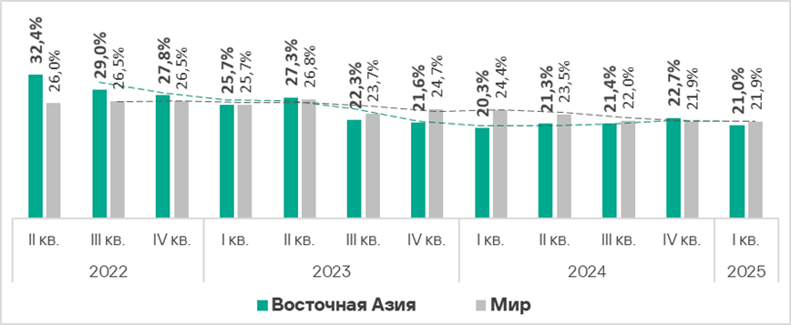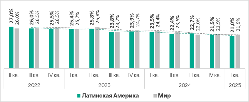 Значение этого показателя в регионе — одно из самых низких, оно существенно ниже среднемирового. В первом квартале 2025 года оно увеличилось на 0,2 п. п.