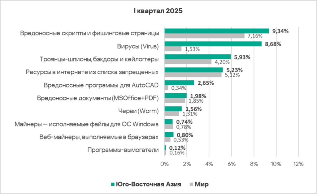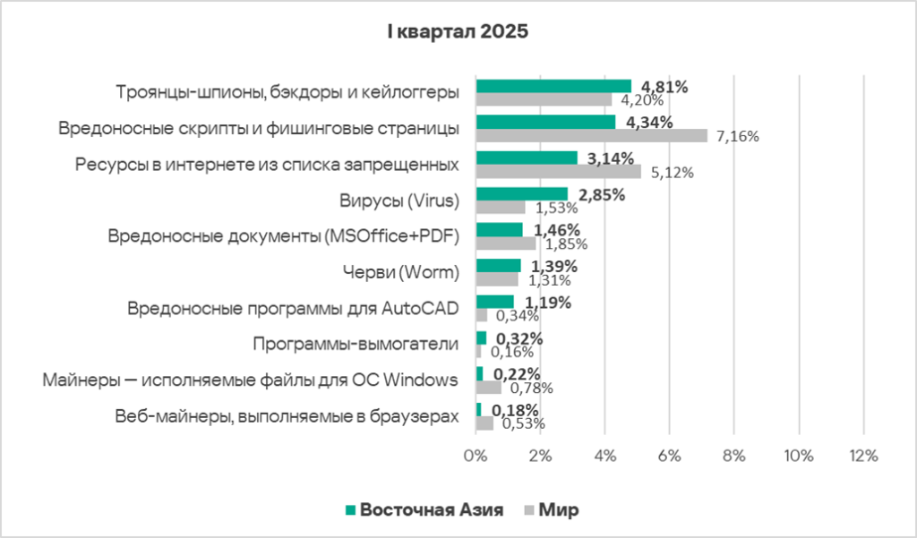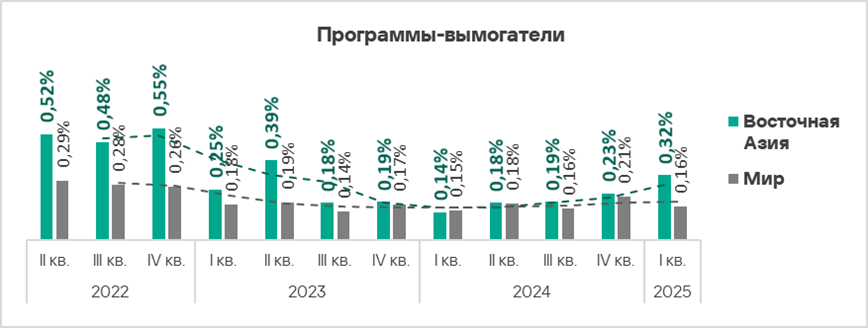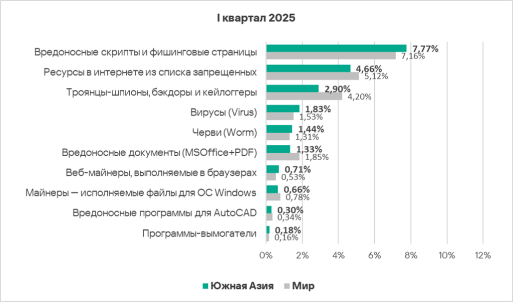 По сравнению с предыдущим кварталом в первом квартале 2025 года доля компьютеров АСУ, на которых были заблокированы вредоносные объекты, увеличилась в шести регионах, больше всего — в России и Центральной Азии.