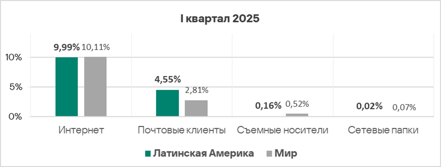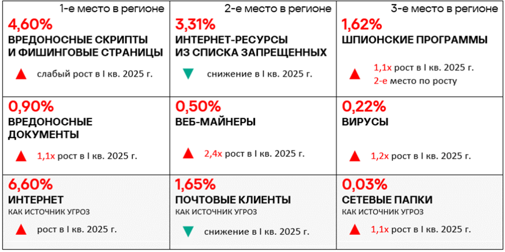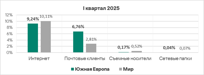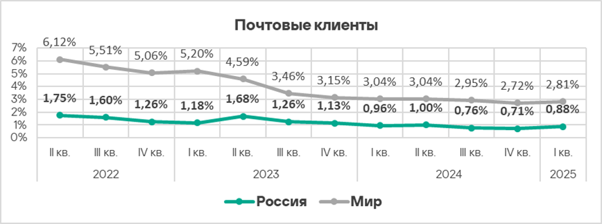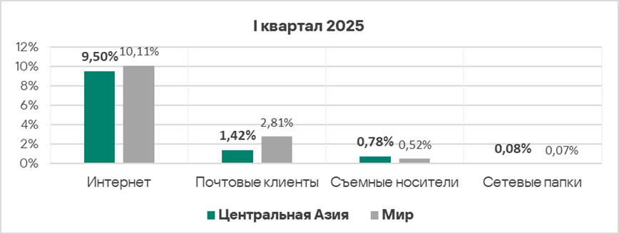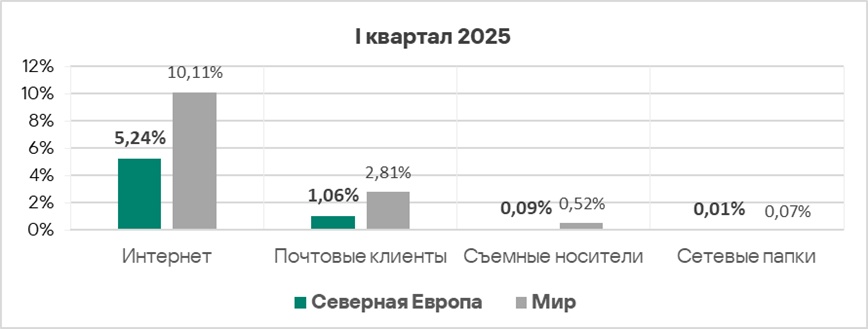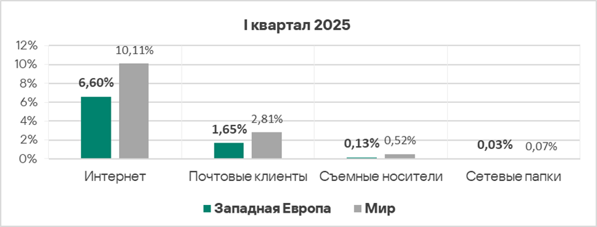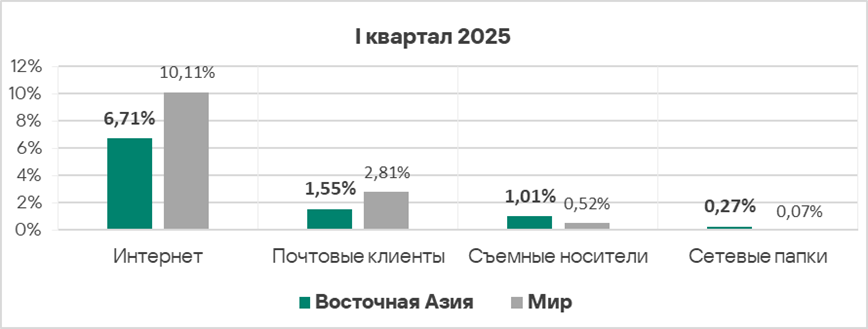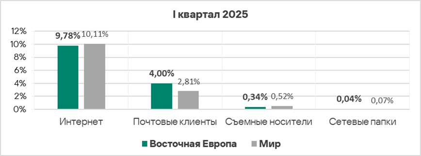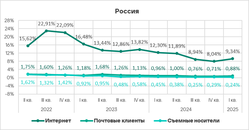 Уровень угроз из интернета и почтовых клиентов в первом квартале 2025 года вырос в 1,2 раза по каждому источнику.