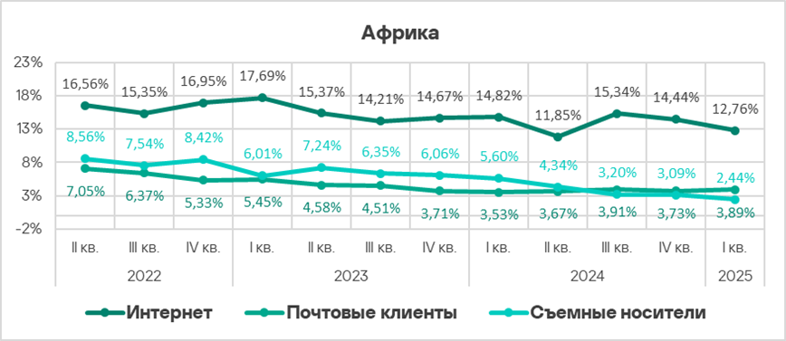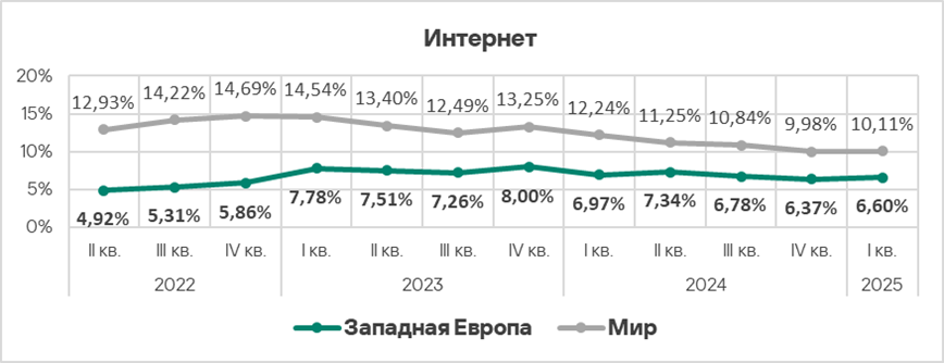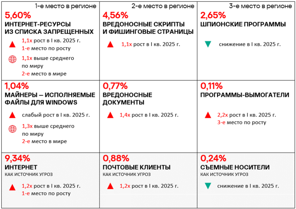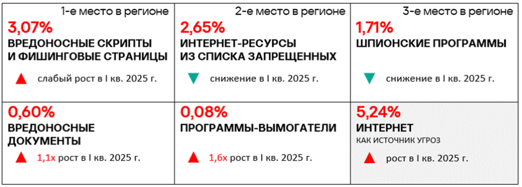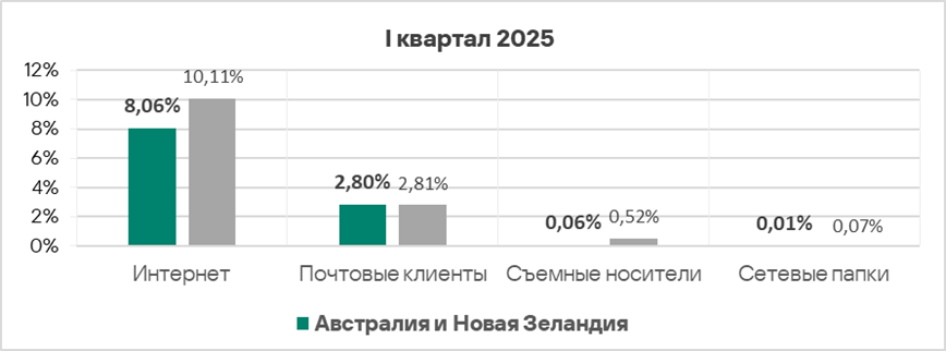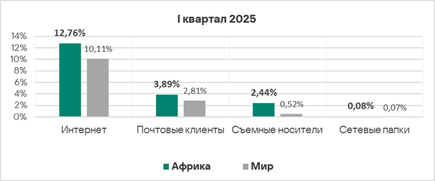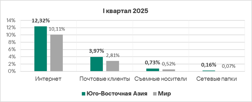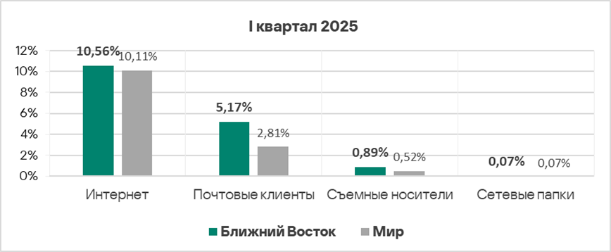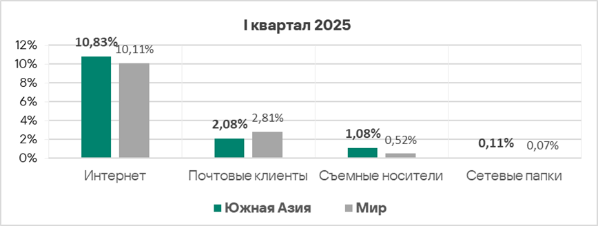 Уровень угроз из интернета и почтовых клиентов в первом квартале 2025 года вырос в 1,2 раза по каждому источнику.