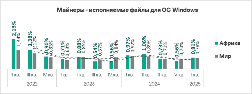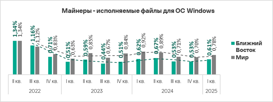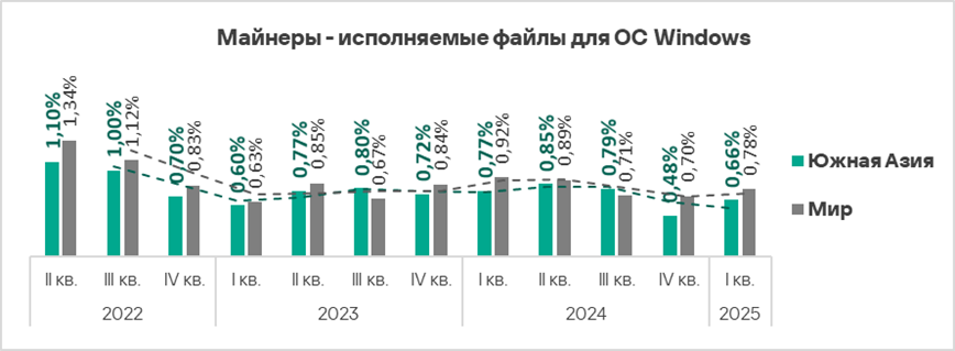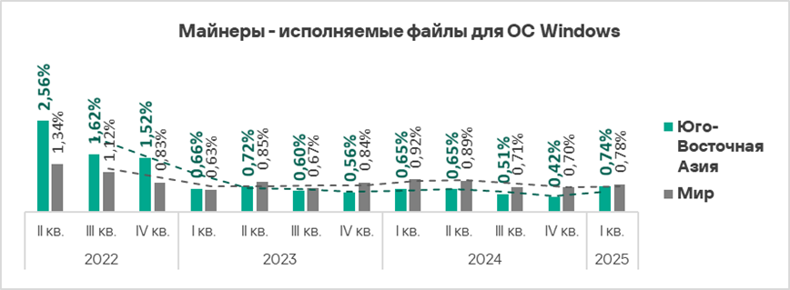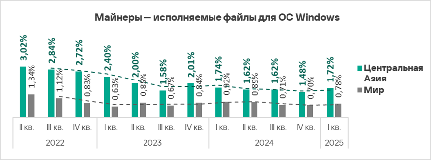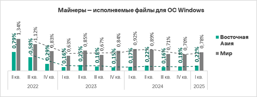- В первом квартале 2025 года Россия находится также на втором месте среди регионов по доле компьютеров АСУ, на которых были заблокированы майнеры — исполняемые файлы для ОС Windows.