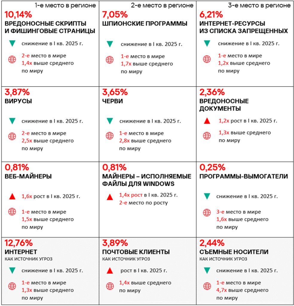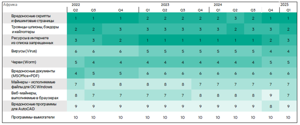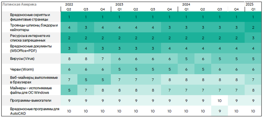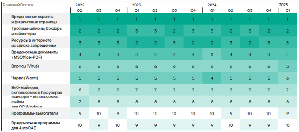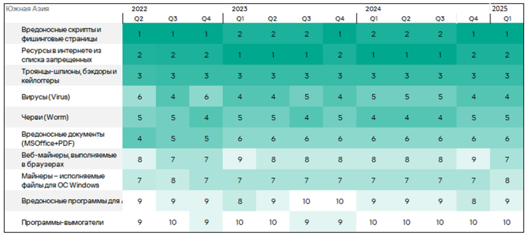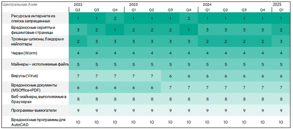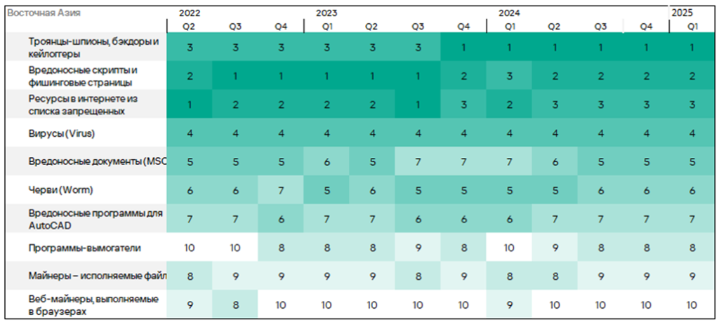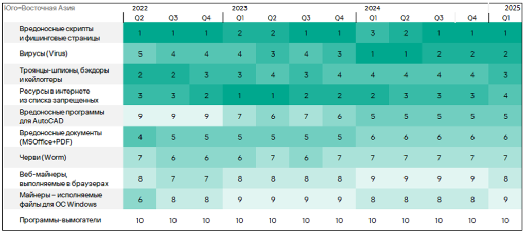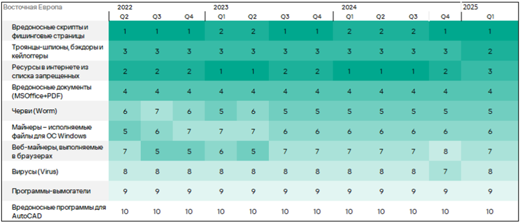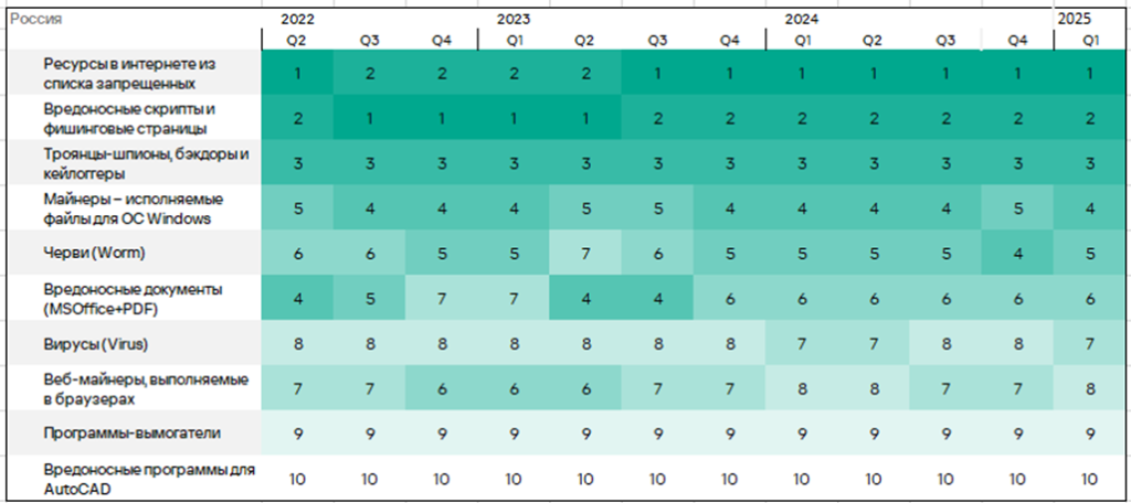 Тепловая карта иллюстрирует изменения в рейтингах категорий угроз в России со второго квартала 2022 года. Ведущей категорией угроз в регионе, начиная с третьего квартала 2023 года, являются ресурсы в интернете из списка запрещенных. В первом квартале 2025 года майнеры — исполняемые файлы для ОС Windows поднялись с пятого места на четвертое, а вирусы — с восьмого на седьмое место.