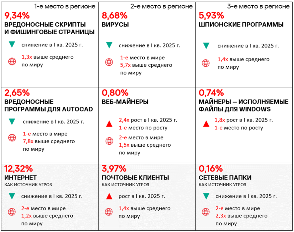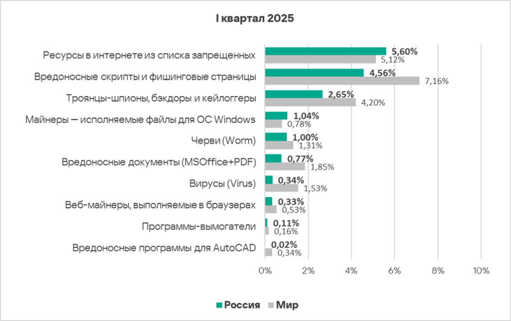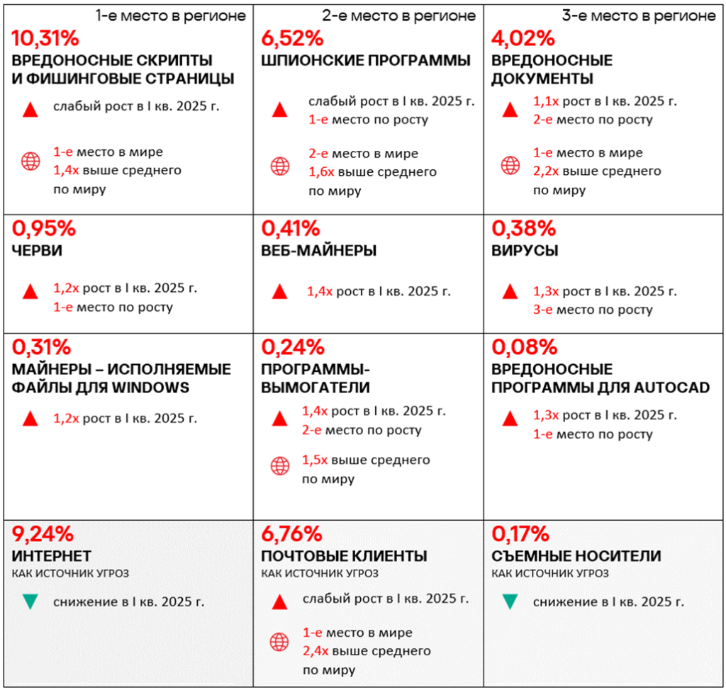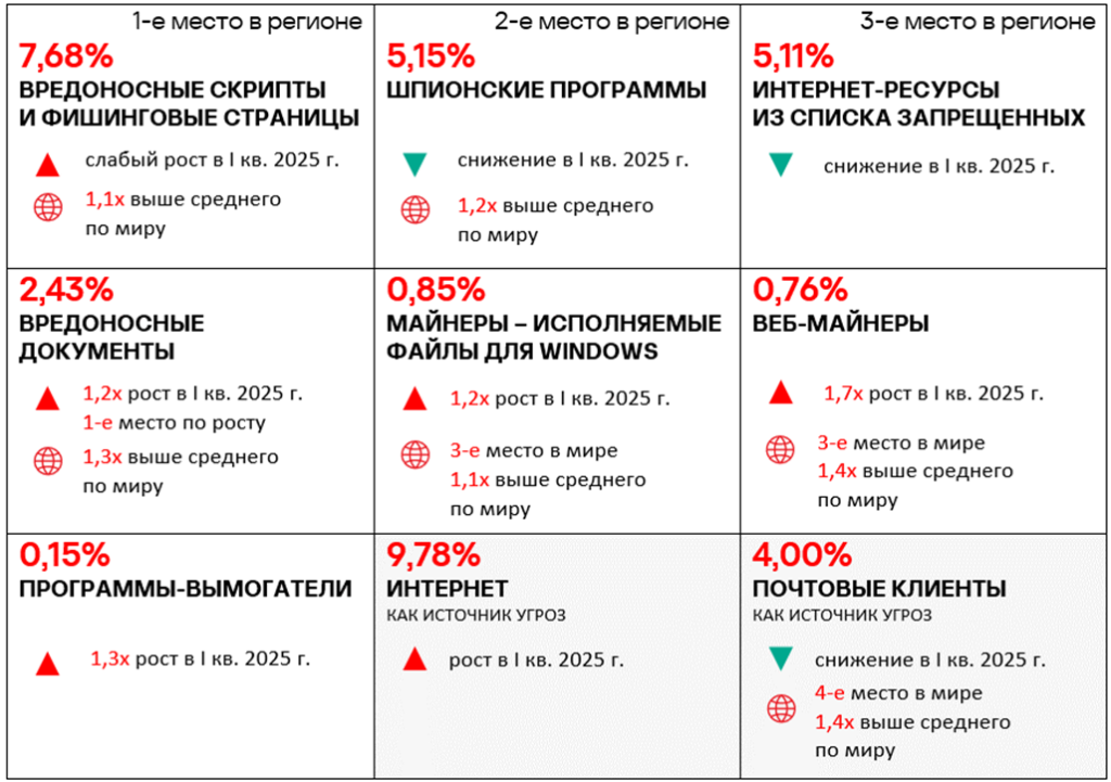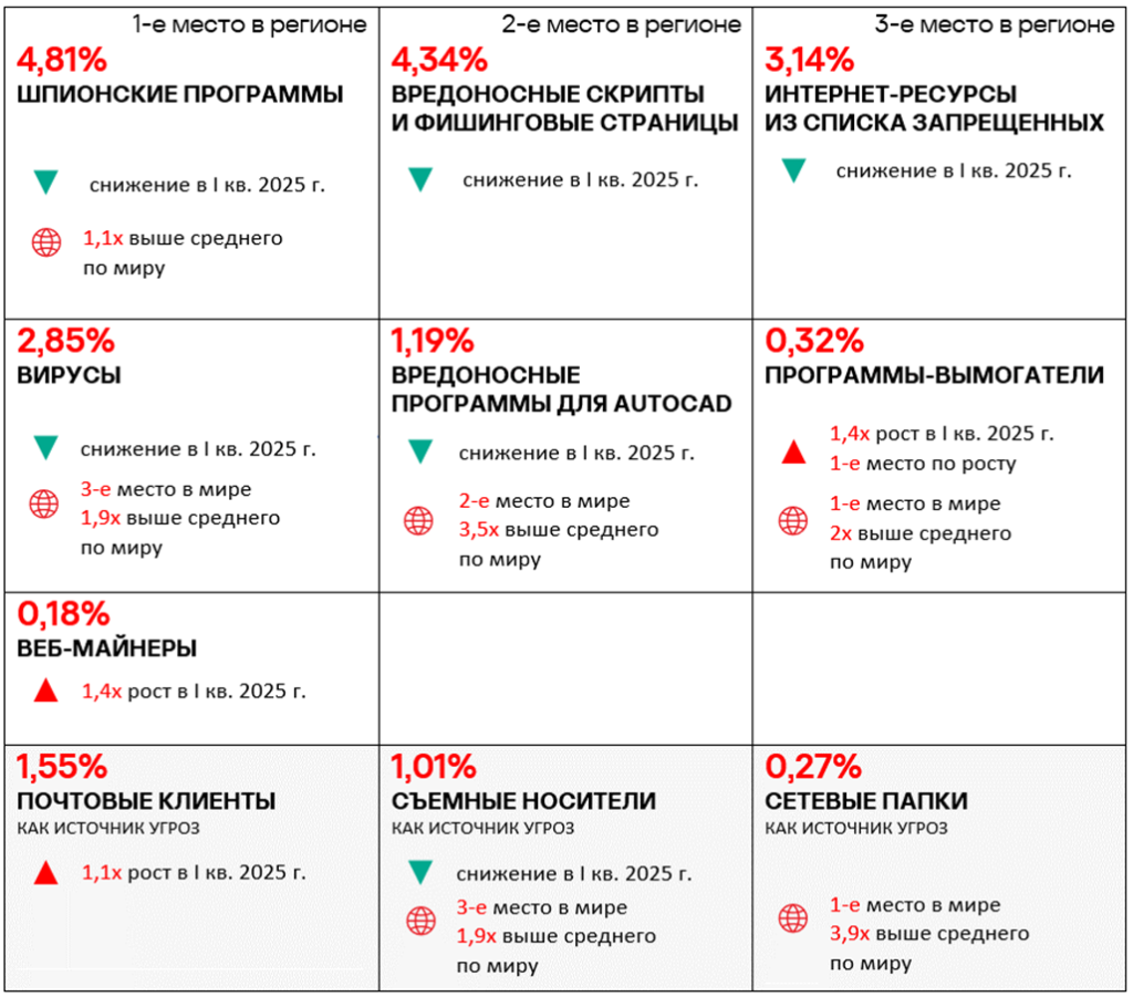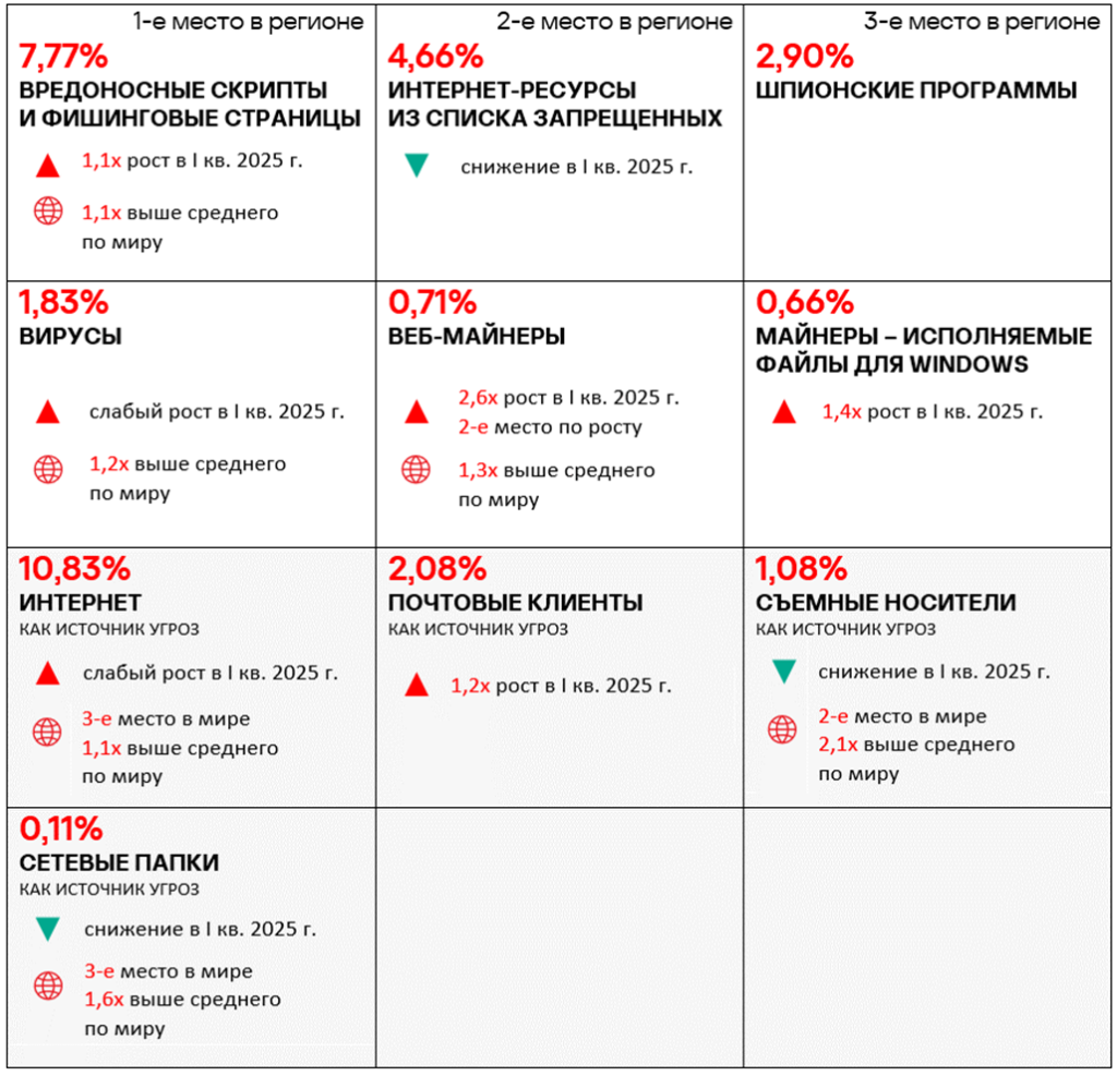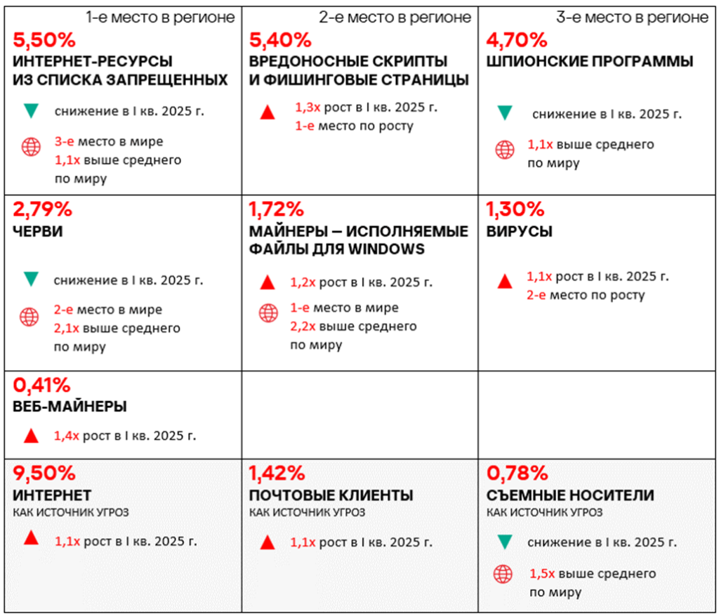Тепловая карта иллюстрирует изменения в рейтингах категорий угроз в России со второго квартала 2022 года. Ведущей категорией угроз в регионе, начиная с третьего квартала 2023 года, являются ресурсы в интернете из списка запрещенных. В первом квартале 2025 года майнеры — исполняемые файлы для ОС Windows поднялись с пятого места на четвертое, а вирусы — с восьмого на седьмое место.