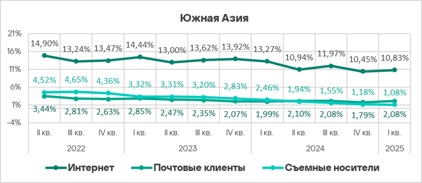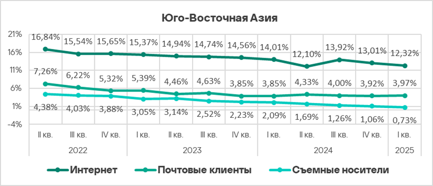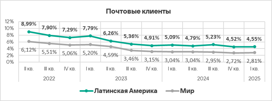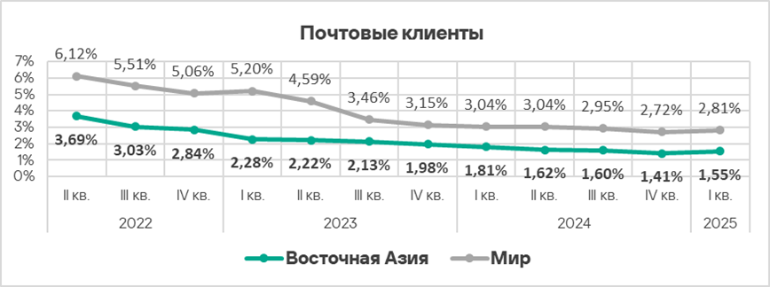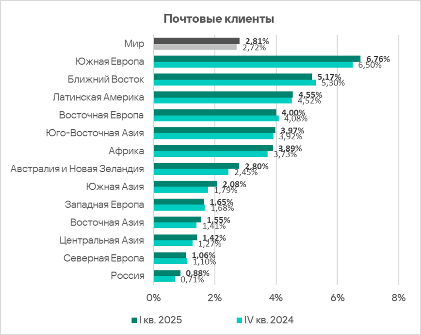 Показатели всех источников угроз в России ниже соответствующих среднемировых значений. Показатель почтовых клиентов в России — самый маленький среди регионов.