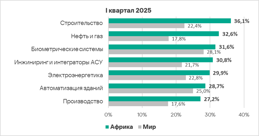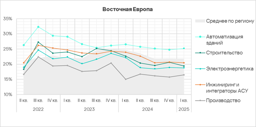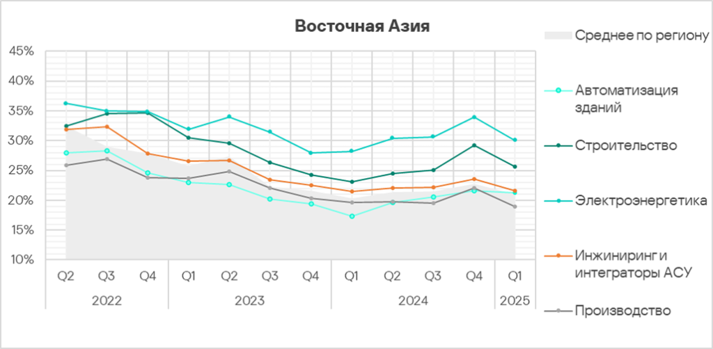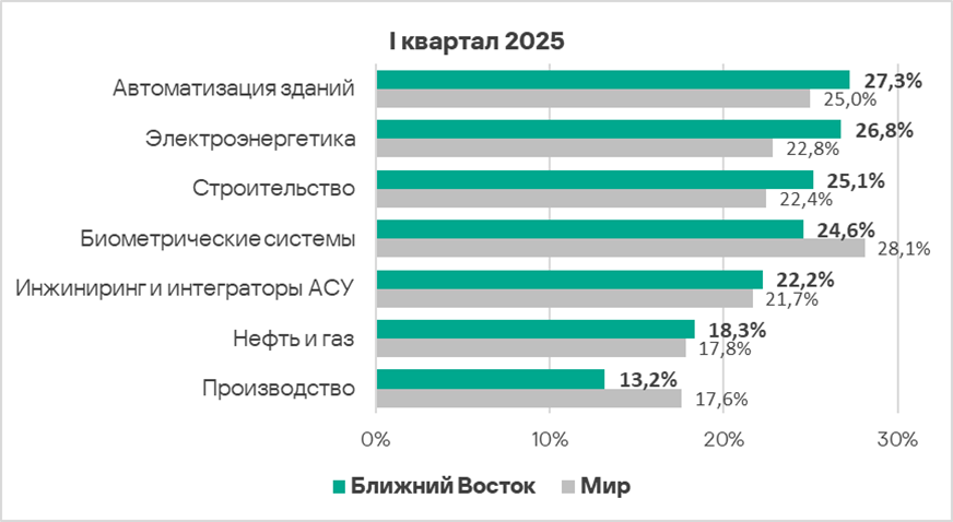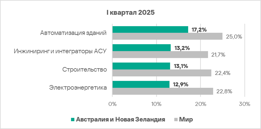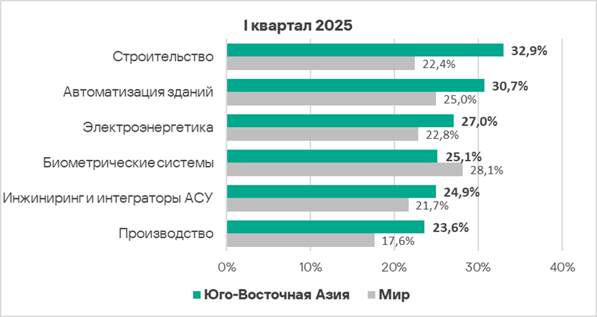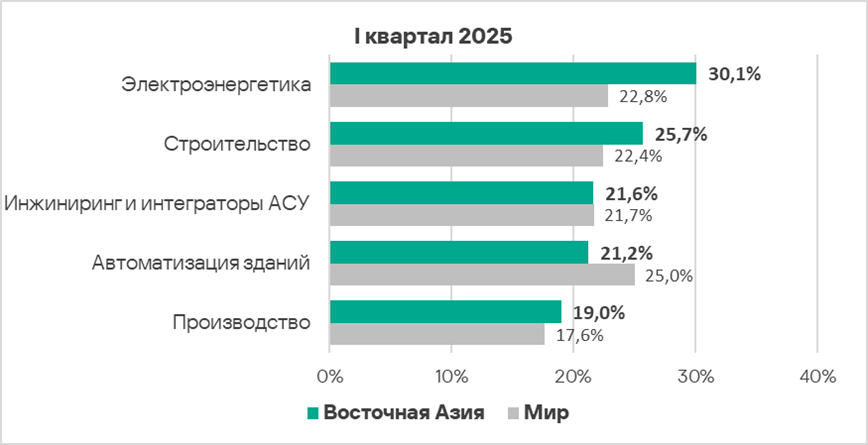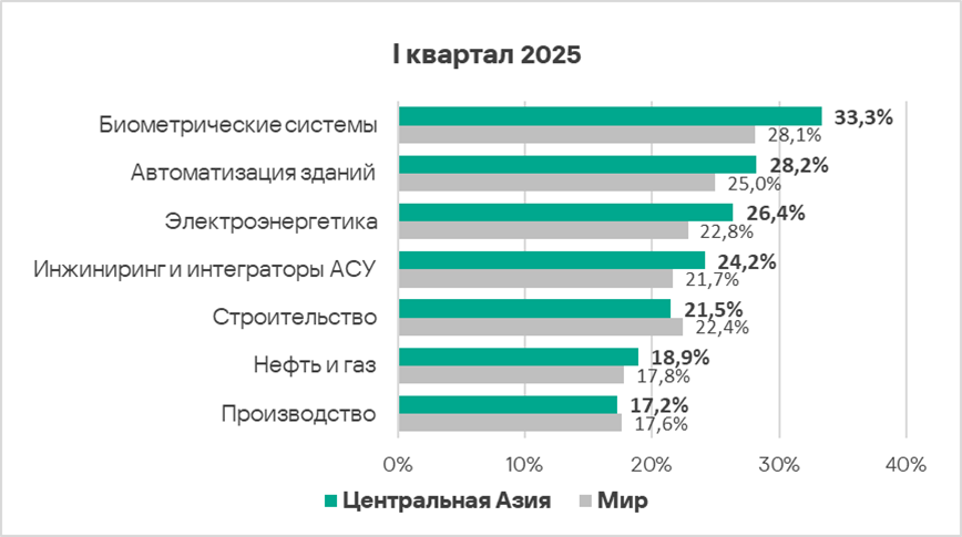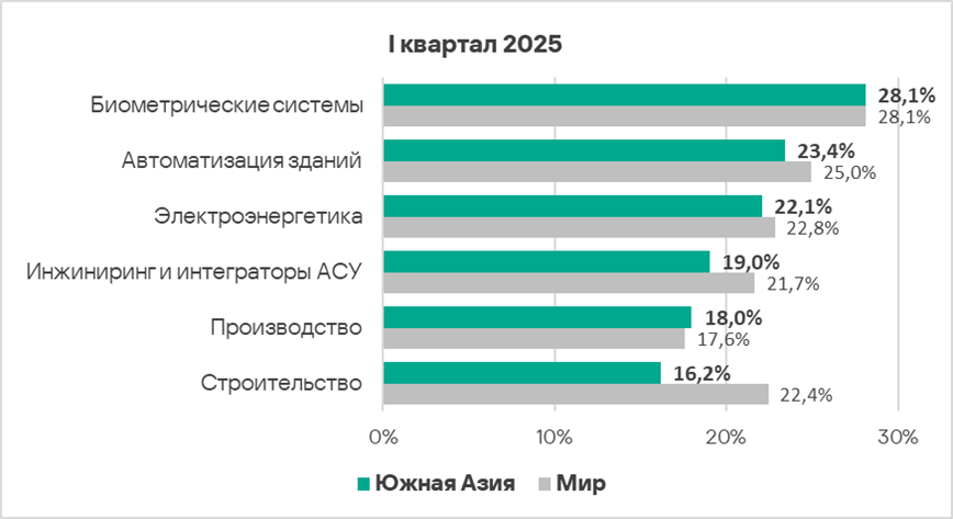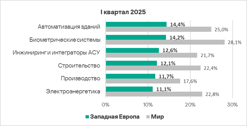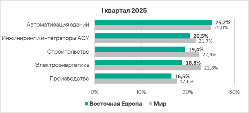 В первом квартале 2025 года из всех рассмотренных отраслях региона доля компьютеров АСУ, на которых были заблокированы вредоносные объекты, выросла в двух отраслях — автоматизация зданий, инжиниринг и интеграторы АСУ.