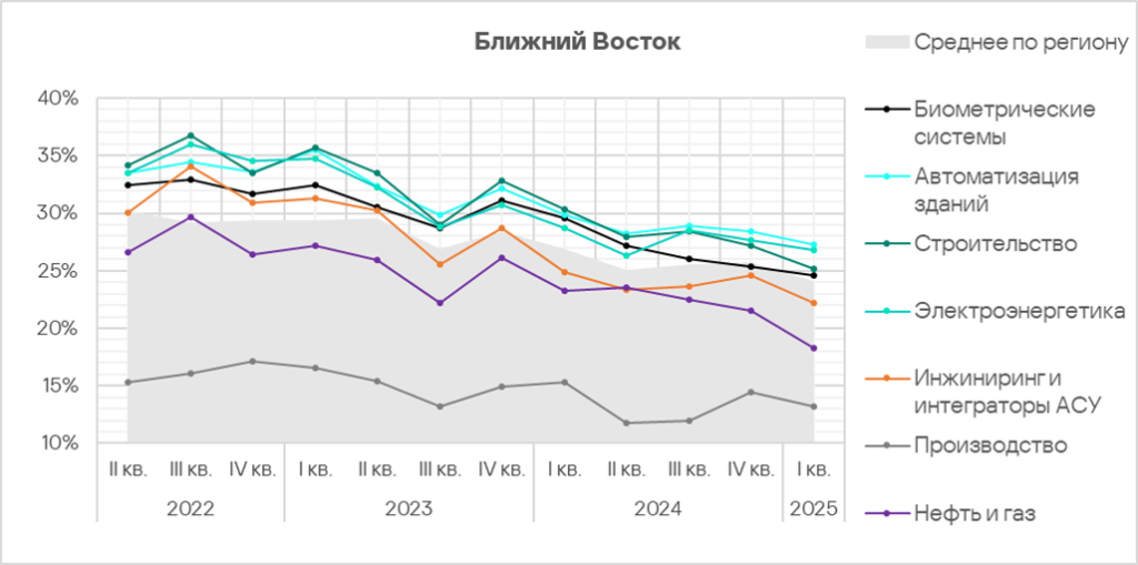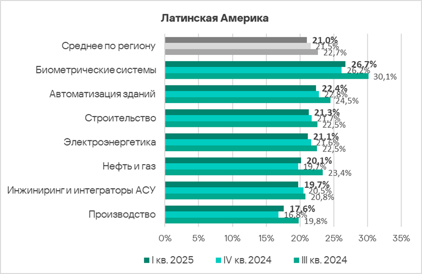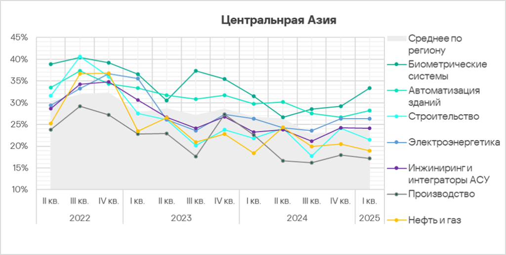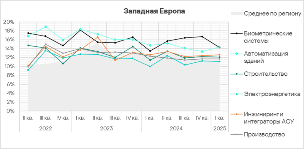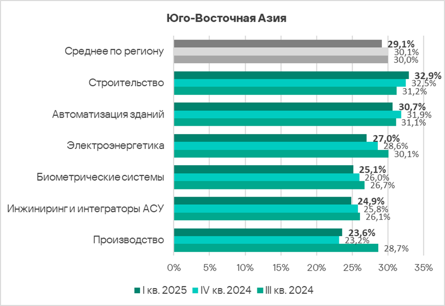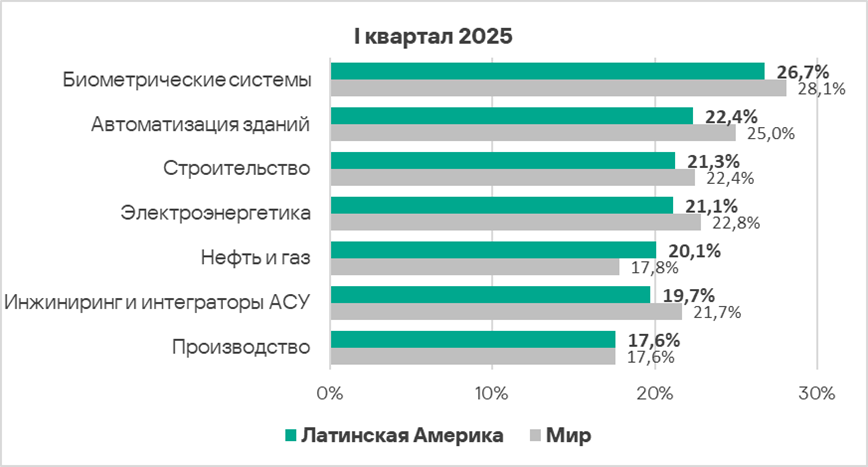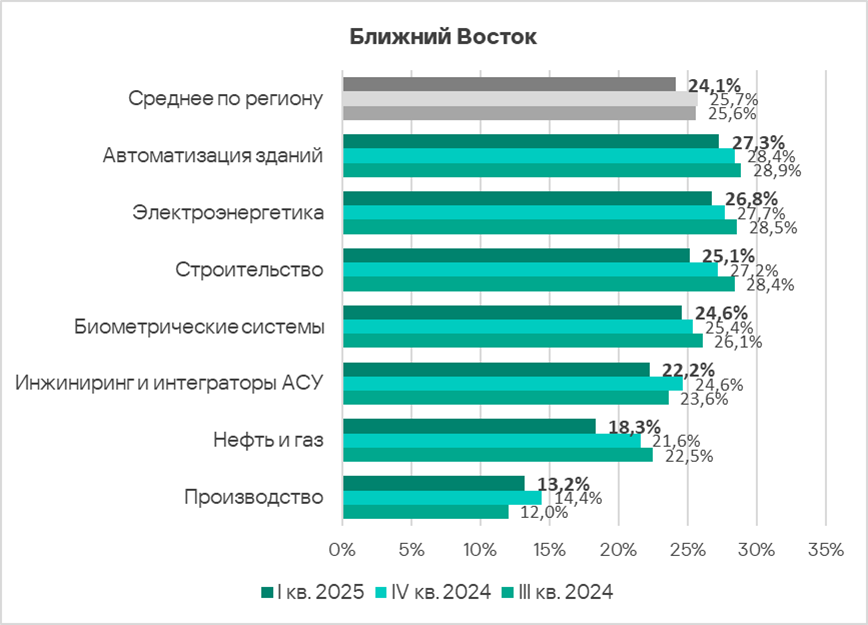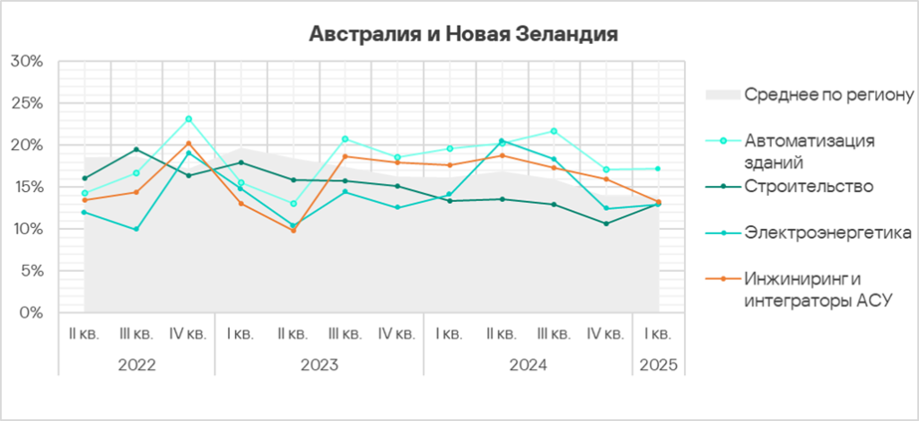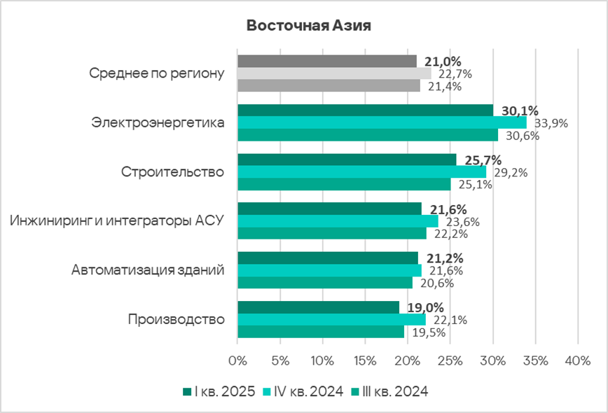 В первом квартале 2025 года из всех рассмотренных отраслях региона доля компьютеров АСУ, на которых были заблокированы вредоносные объекты, выросла в двух отраслях — автоматизация зданий, инжиниринг и интеграторы АСУ.