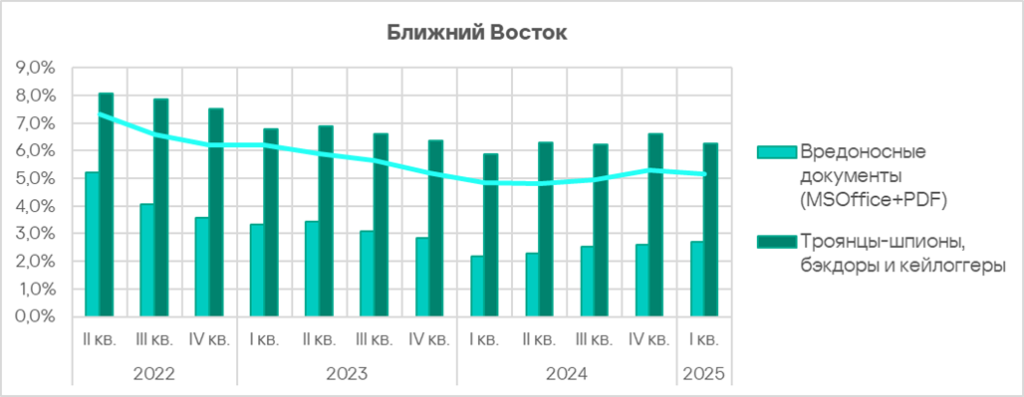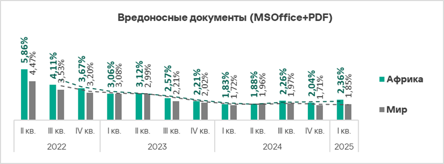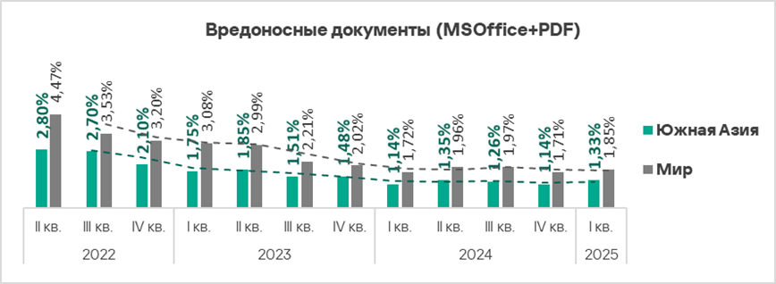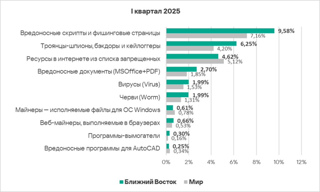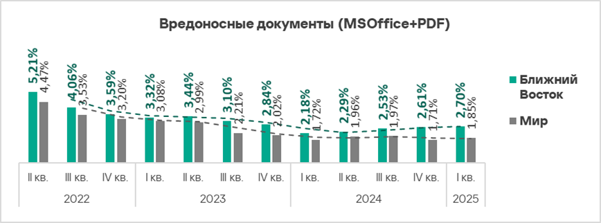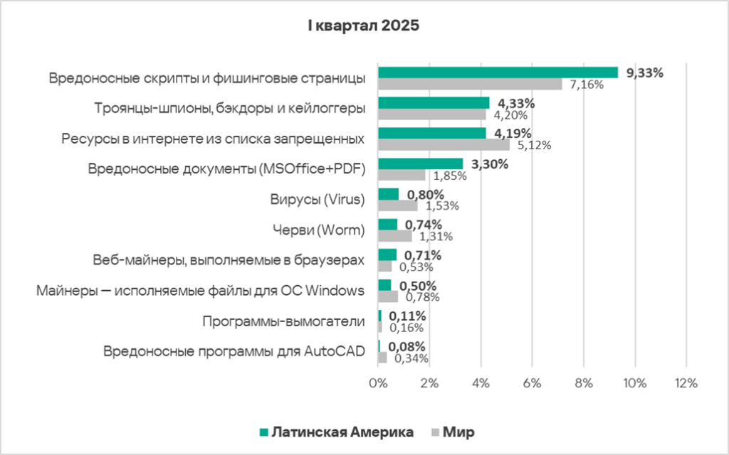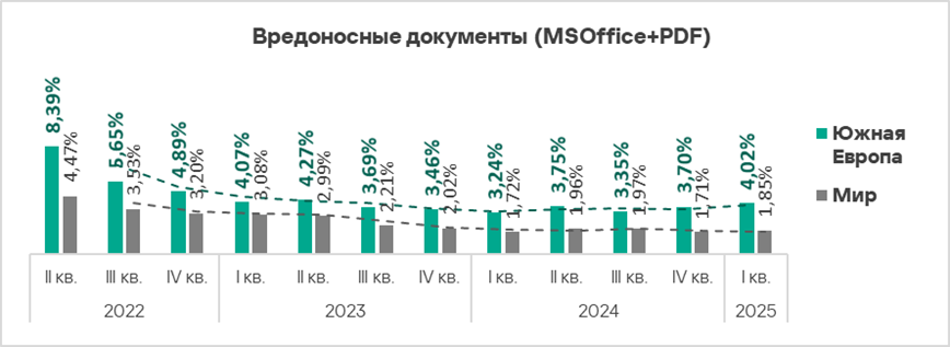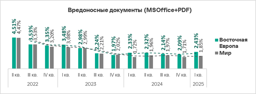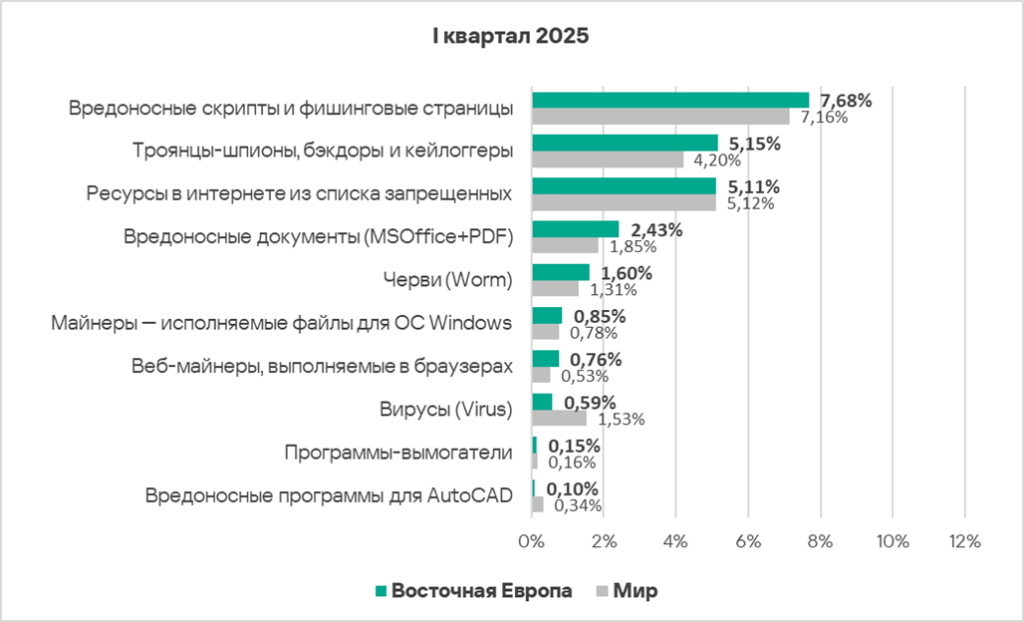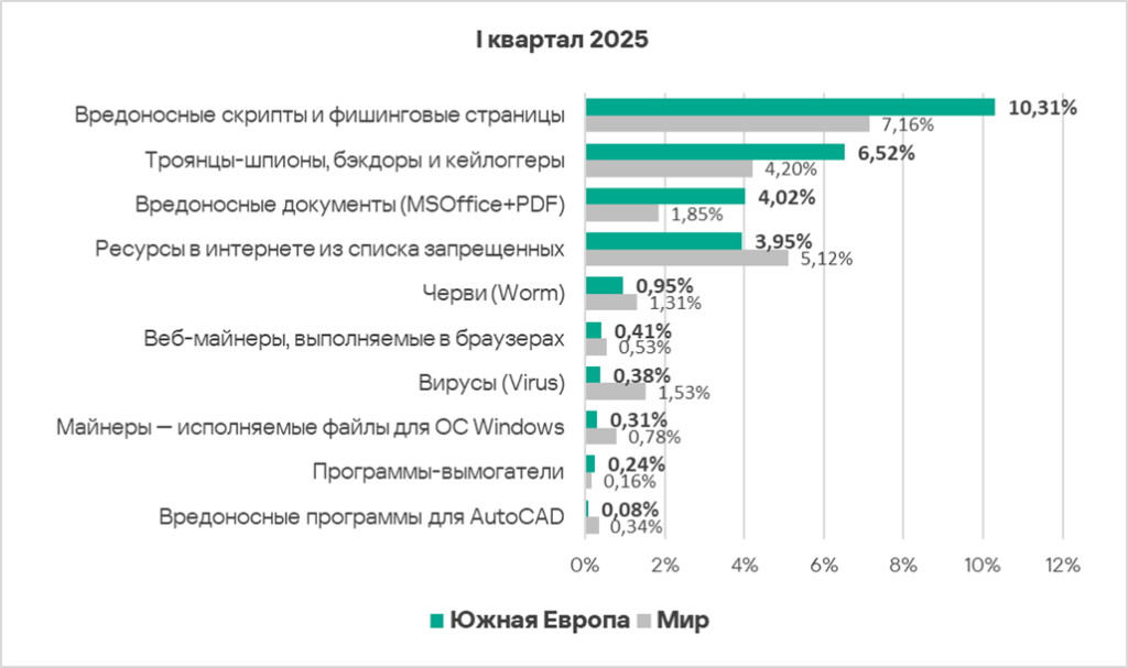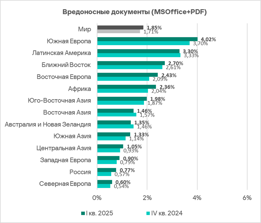 В мире в первом квартале 2025 года доля компьютеров АСУ, на которых были заблокированы вредоносные документы, выросла в 1,1 раза. Показатель увеличился почти во всех регионах, в тройку лидеров по росту вошли: Восточная Европа, Африка и Южная Европа.