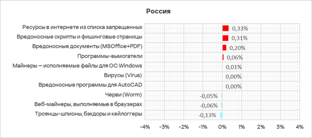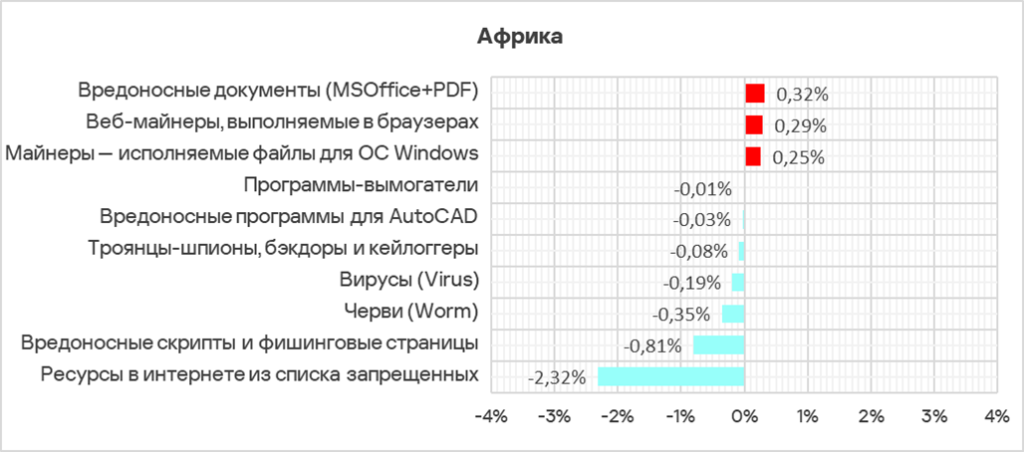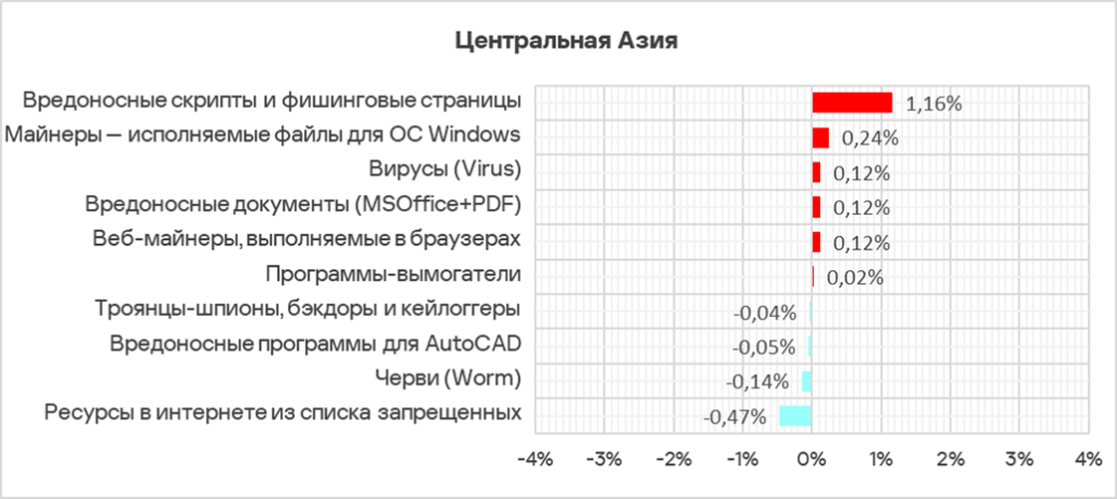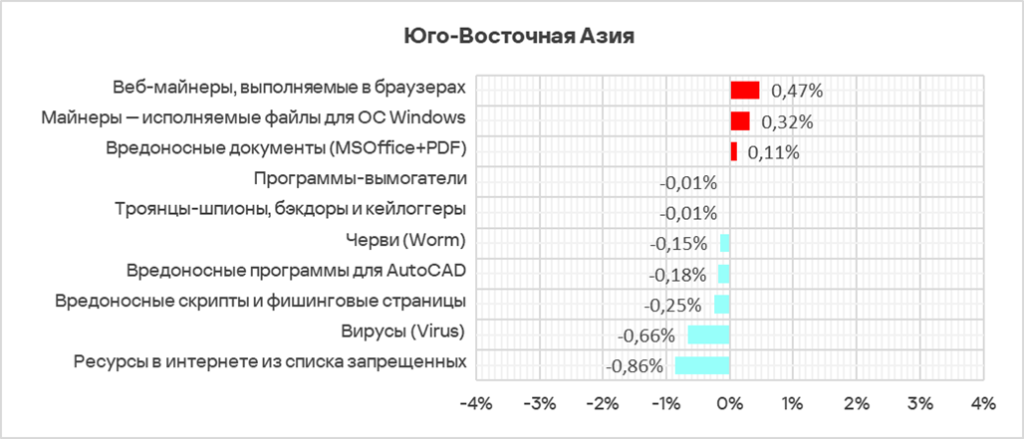 Больше всего за квартал доля компьютеров АСУ, на которых были заблокированы угрозы из интернета, выросла в России (+1,29 п. п.), Центральной Азии (+1,04 п. п.), Австралии и Новой Зеландии (+0,51 п. п.).
