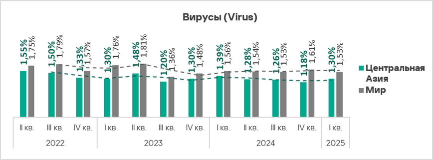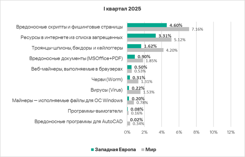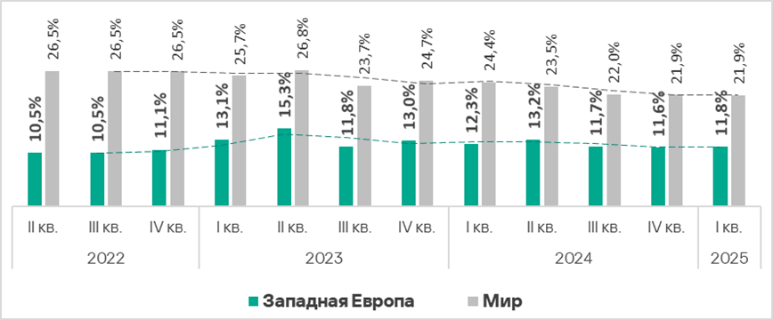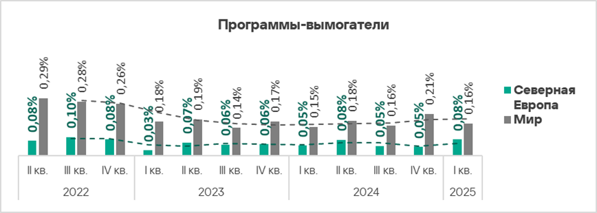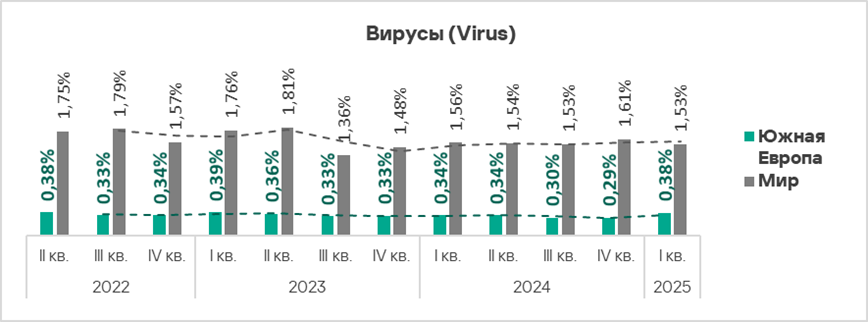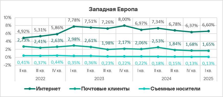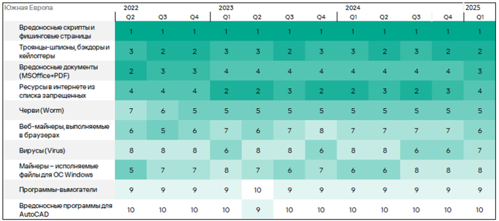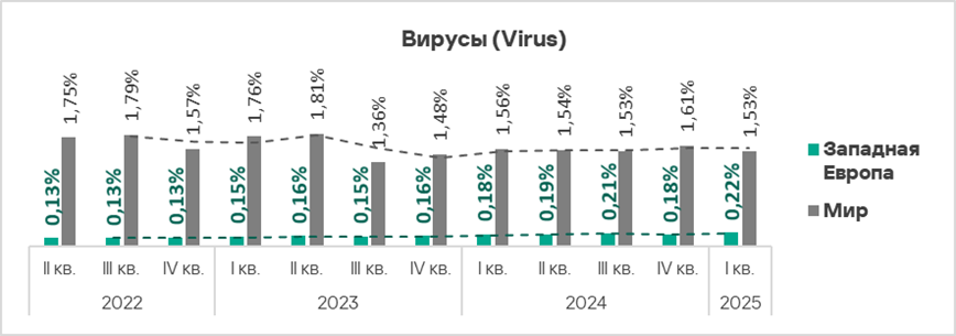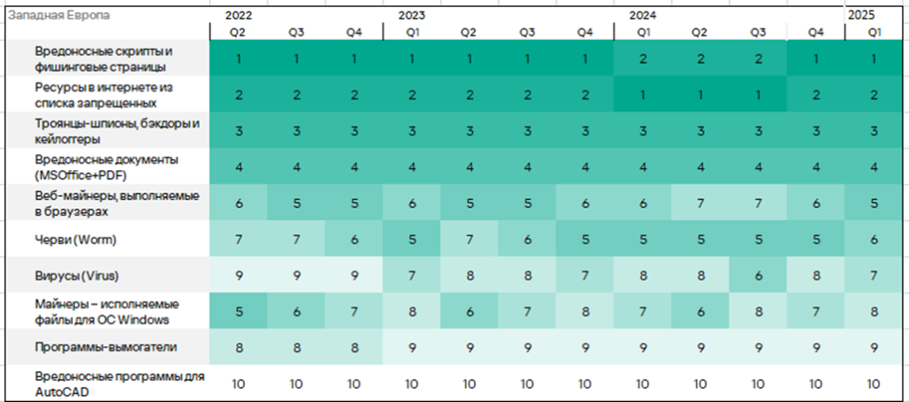 Тепловая карта иллюстрирует изменения в рейтингах категорий угроз в Западной Европе со второго квартала 2022 года. В первом квартале 2025 года вирусы поднялись с восьмого на седьмое место.