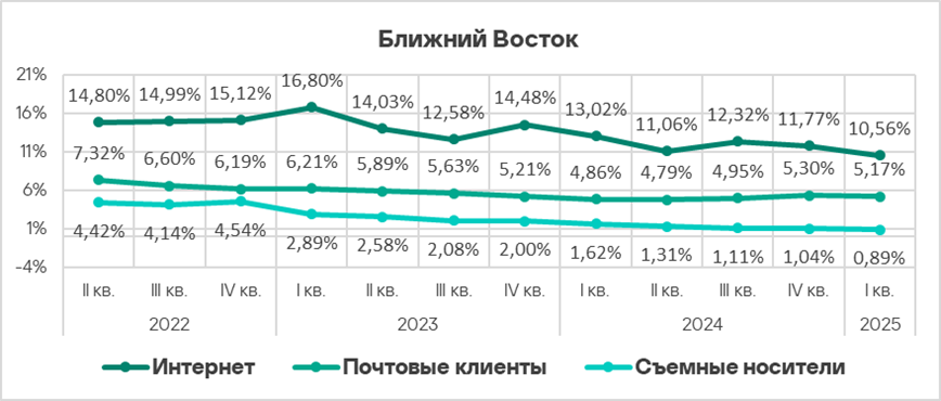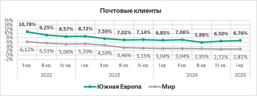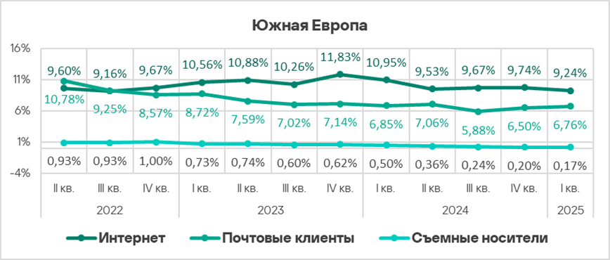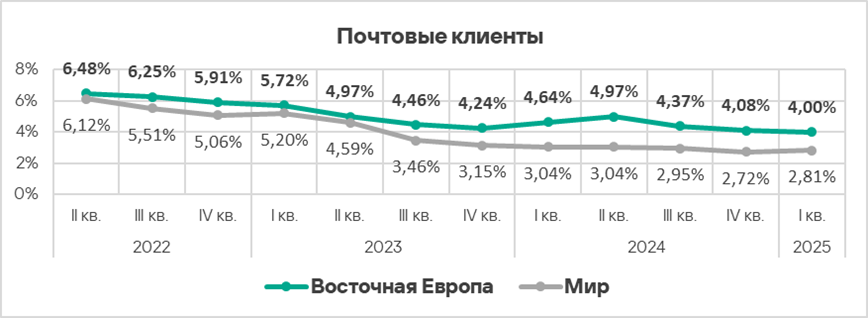 Регионы из топ-3 — неизменные лидеры этого рейтинга. Проблема электронной почты как источника угроз характерна также для Восточной Европы (4,00%).
