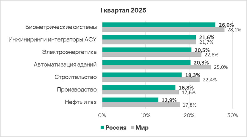 В России из всех рассмотренных в отчете отраслей и ОТ-инфраструктур чаще всего вредоносные объекты блокируются в биометрических системах.