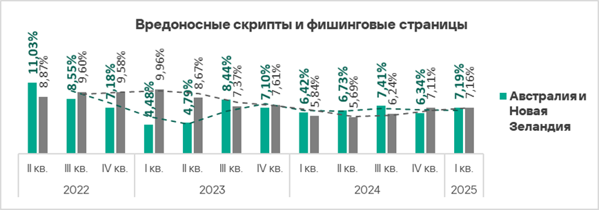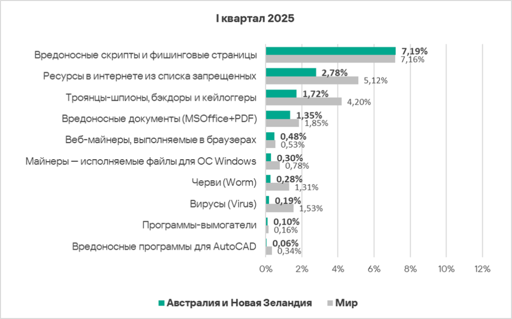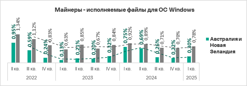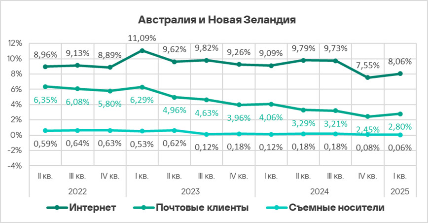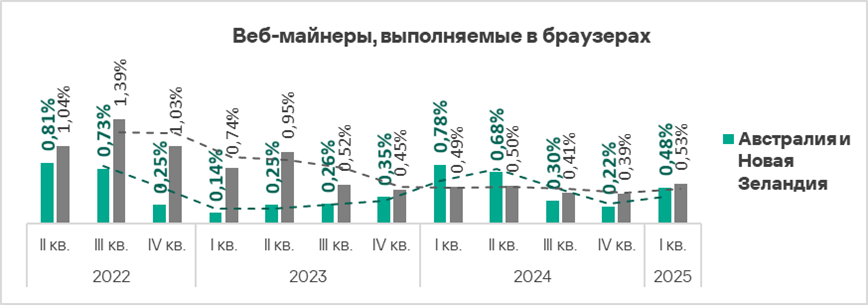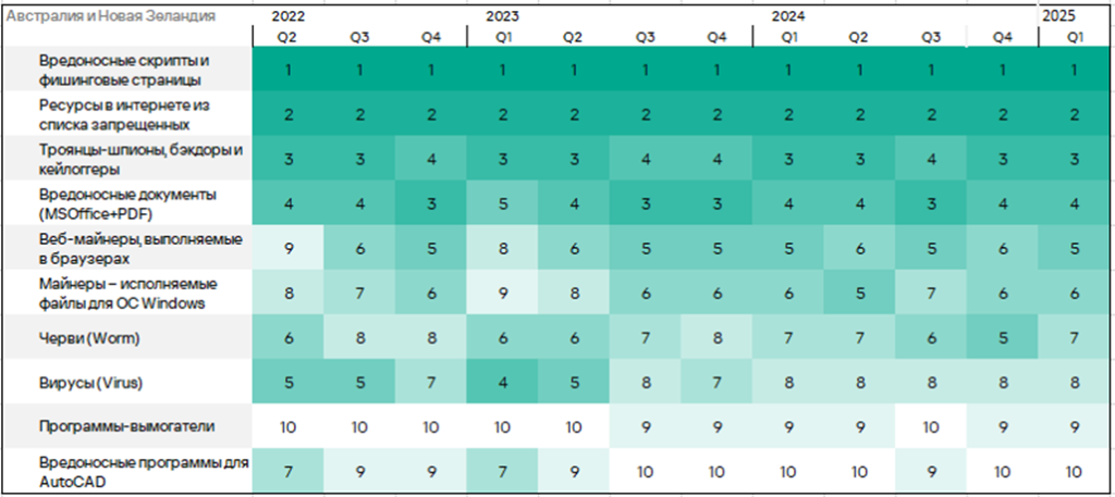 Тепловая карта иллюстрирует изменения в рейтингах категорий угроз в Австралии и Новой Зеландии со второго квартала 2022 года. В первом квартале 2025 года веб-майнеры поднялись с шестой на пятую позицию.