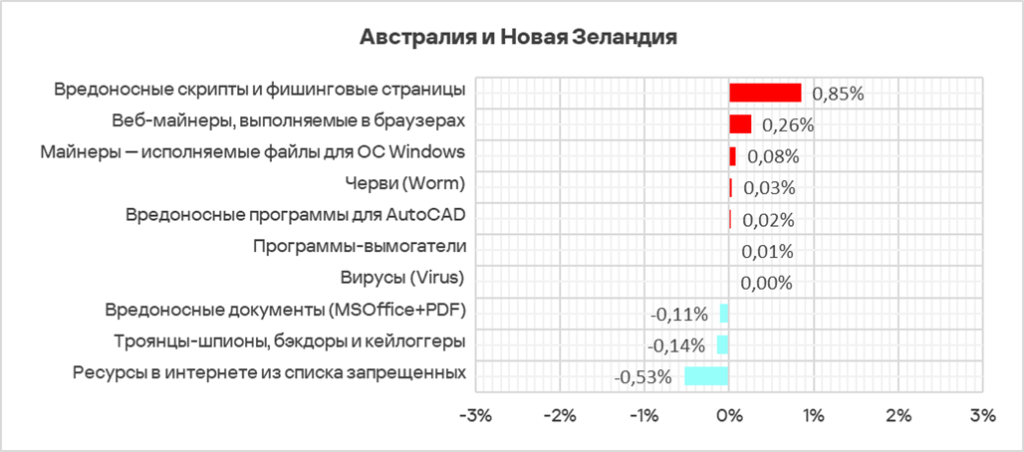 В рейтинге регионов по доле компьютеров АСУ, на которых были заблокированы угрозы из почтовых клиентов, регион находится на седьмом месте. По росту доли компьютеров АСУ, на которых были заблокированы угрозы из почтовых клиентов, Австралия и Новая Зеландия занимает первое место среди регионов, по росту показателя угроз из интернета — третье место.
