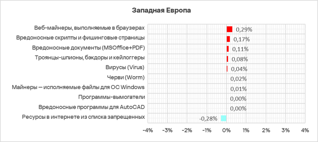 Западная Европа занимает 12-е место в мировом рейтинге по доле компьютеров АСУ, на которых были заблокированы вредоносные объекты.