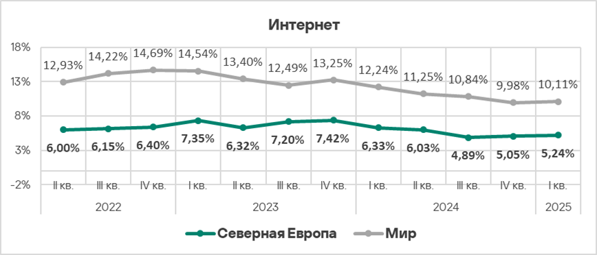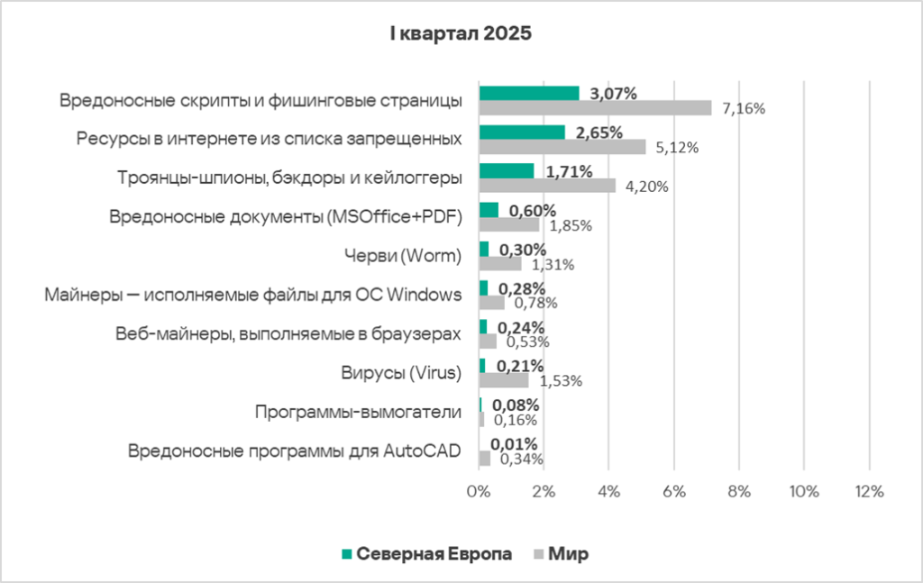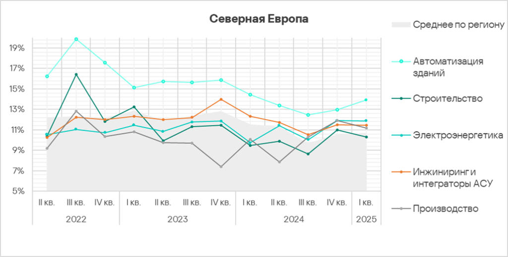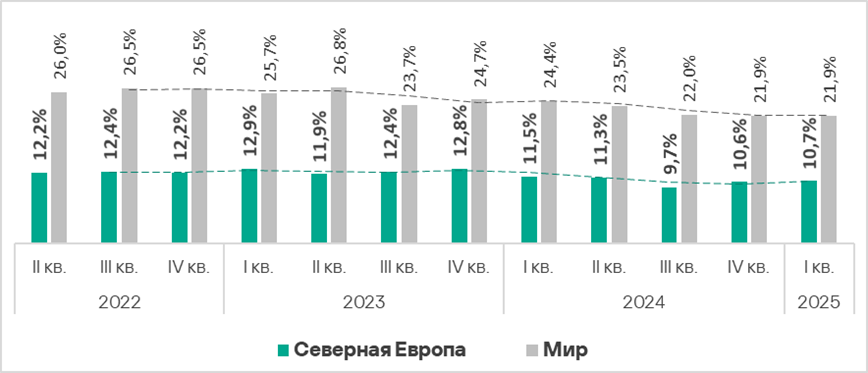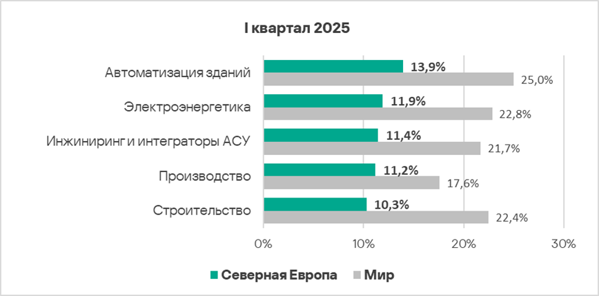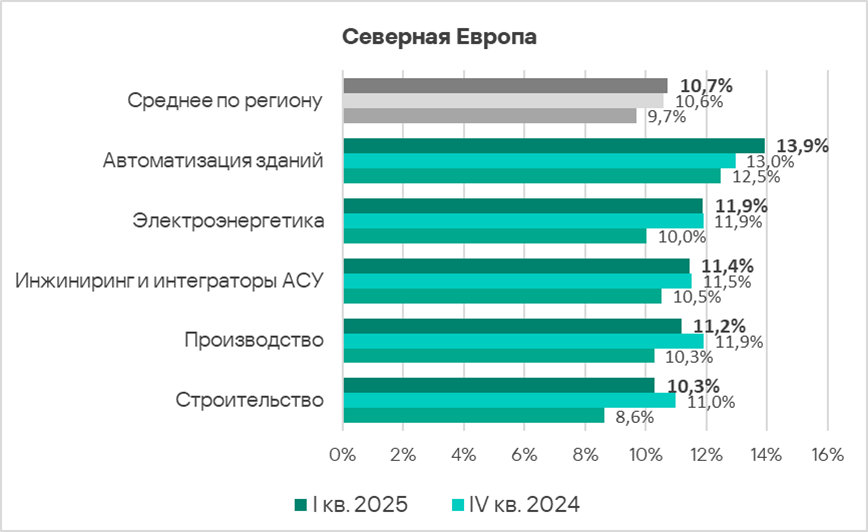 В первом квартале 2025 года доля компьютеров АСУ, на которых были заблокированы вредоносные объекты, в Северной Европе выросла до 10,7%. Это наименьшее значение из всех регионов.