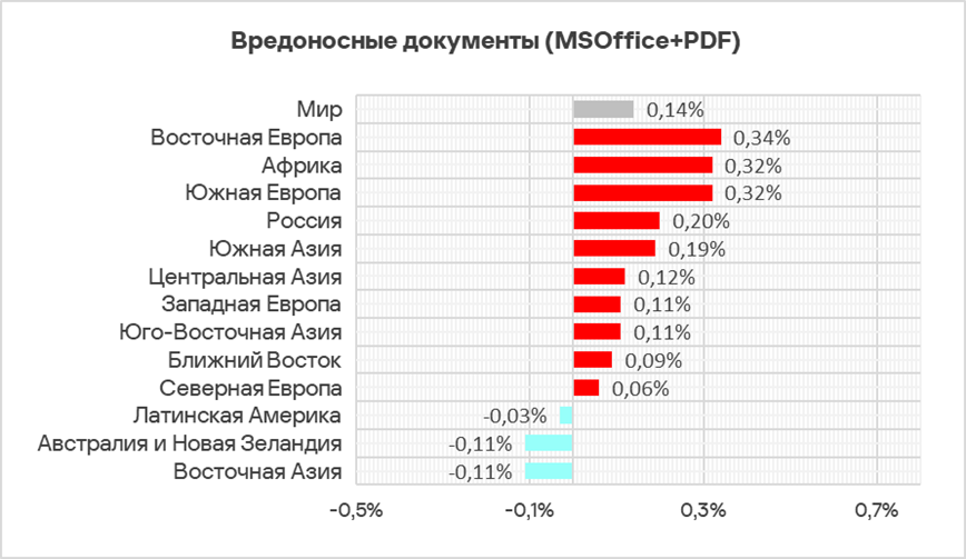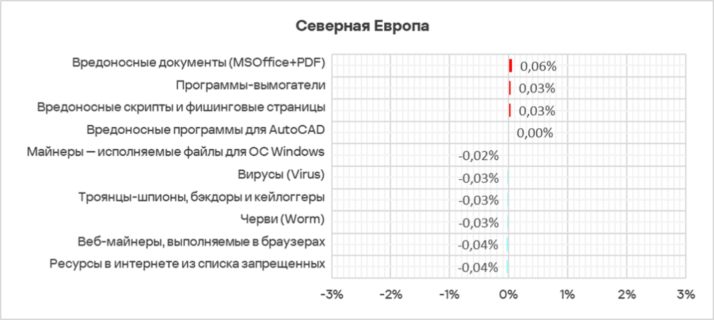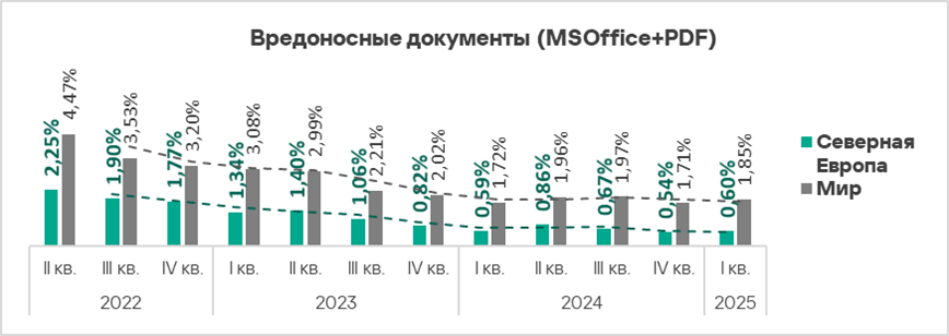 Наименьший показатель вредоносных документов в Северной Европе — 0,60%.