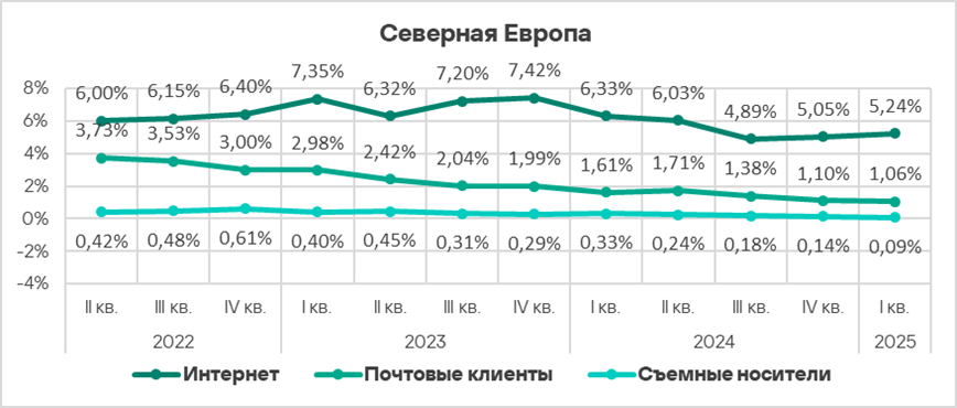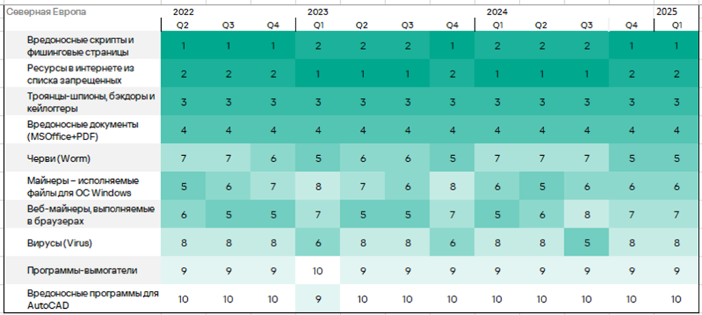 Тепловая карта иллюстрирует изменения в рейтингах категорий угроз в Северной Европе со второго квартала 2022 года. В первом квартале 2025 года изменений в позициях категорий угроз нет.