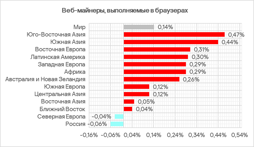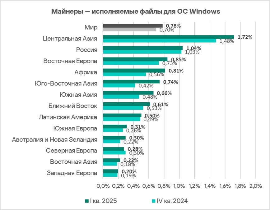 В России в рейтинге категорий угроз по доле компьютеров АСУ, на которых они были заблокированы, майнеры — исполняемые файлы для ОС Windows занимают четвертое место. Среди регионов это самая высокая позиция для данной категории угроз. В аналогичном мировом рейтинге она находится на седьмом месте.