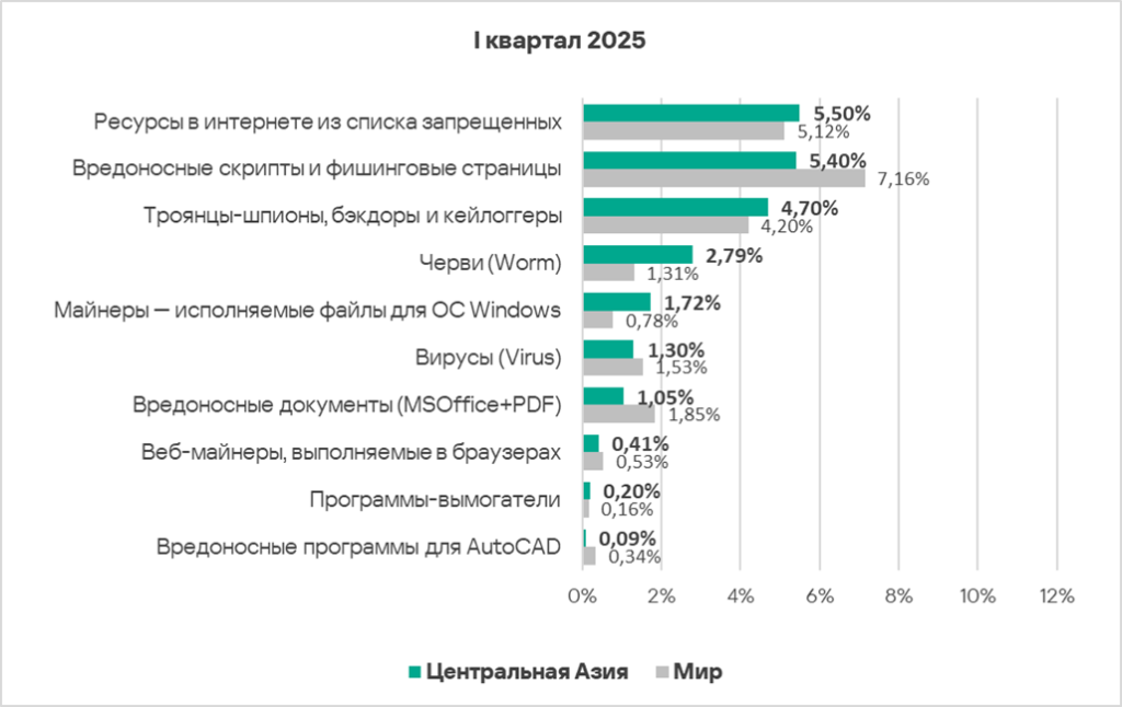 В первом квартале 2025 года доля компьютеров АСУ, на которых были заблокированы вредоносные объекты из интернета, увеличилась.
