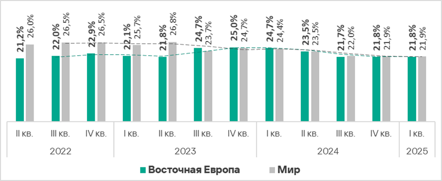 В мире в первом квартале 2025 года доля компьютеров АСУ, на которых были заблокированы вредоносные объекты, не изменилась и составила 21,9%.