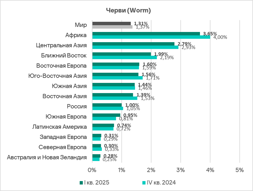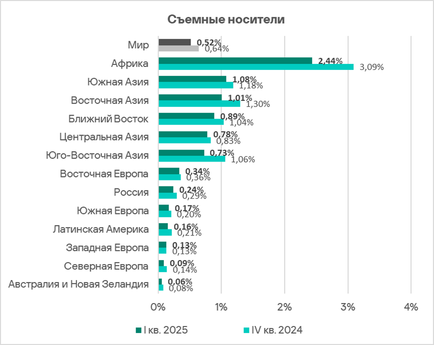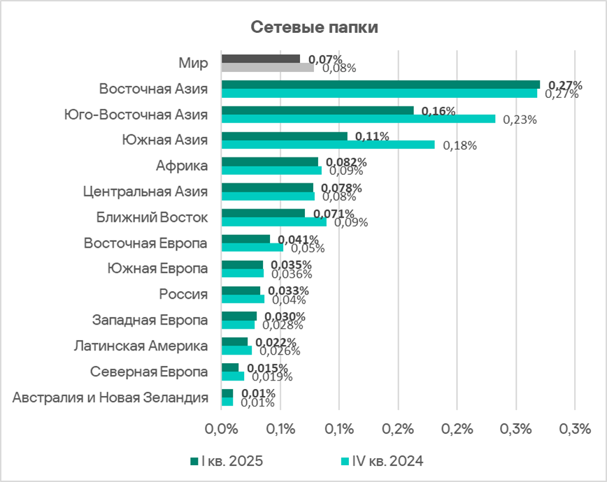Как и в случае съемных носителей, проблема угроз в сетевых папках характерна для регионов Азии, Африки и Ближнего Востока.