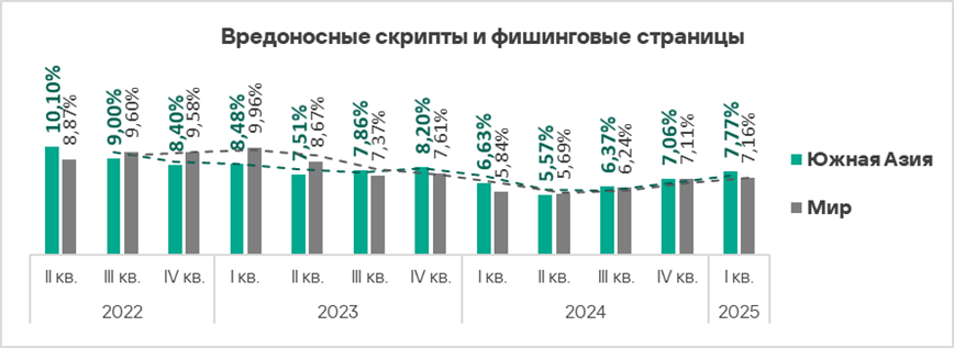 В первом квартале 2025 года показатель уменьшился во всех регионах, за исключением России (+0,33 п. п.), где он увеличился в связи с очередной волной атак на сайты, использующие устаревшие шаблоны АСПРО для CMS Bitrix.