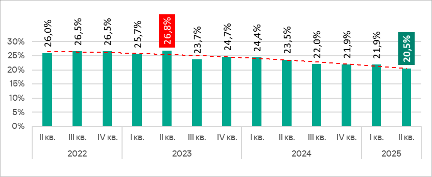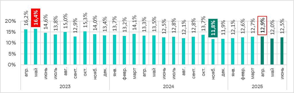 В течение второго квартала 2025 года самым высоким показатель был в апреле.