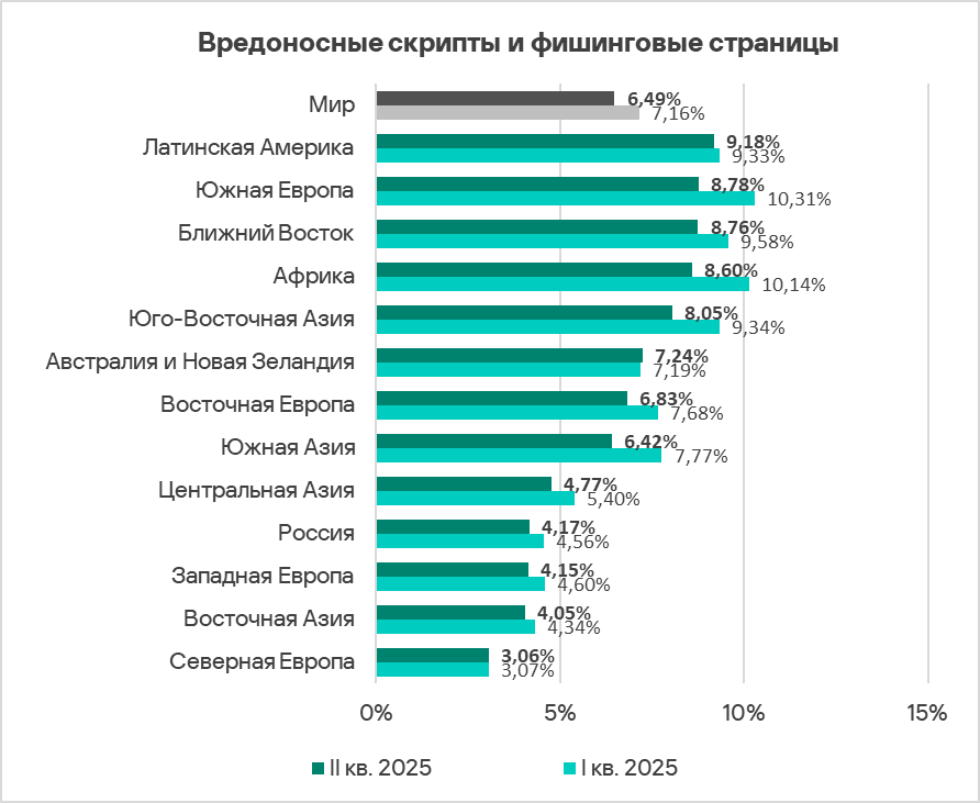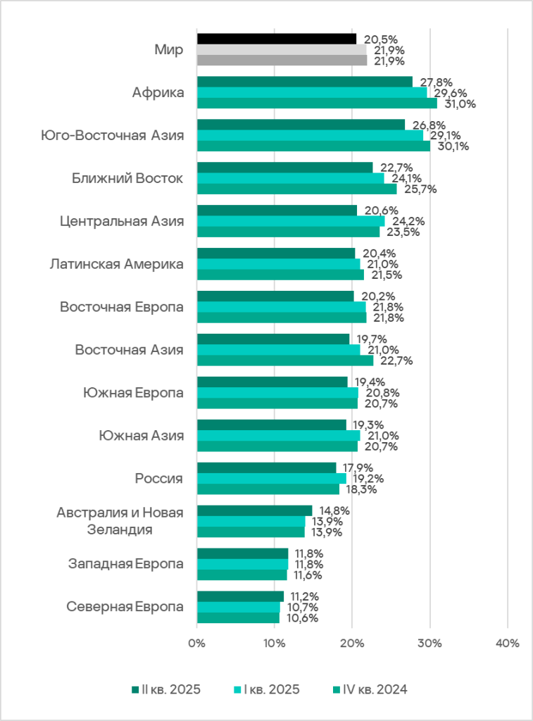 Доля компьютеров АСУ, на которых были заблокированы вирусы, во втором квартале 2025 года уменьшилась во всех регионах, кроме Северной Европы.