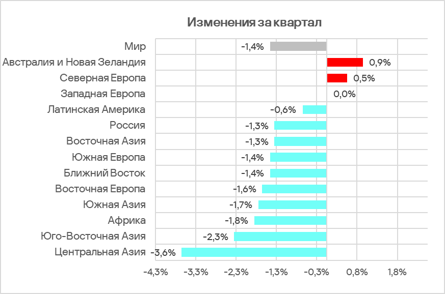 Во большинстве регионов, рассматриваемых в этом отчете, показатель уменьшился по сравнению с предыдущим кварталом. Увеличился он только в Австралии и Новой Зеландии, а также в Северной Европе.