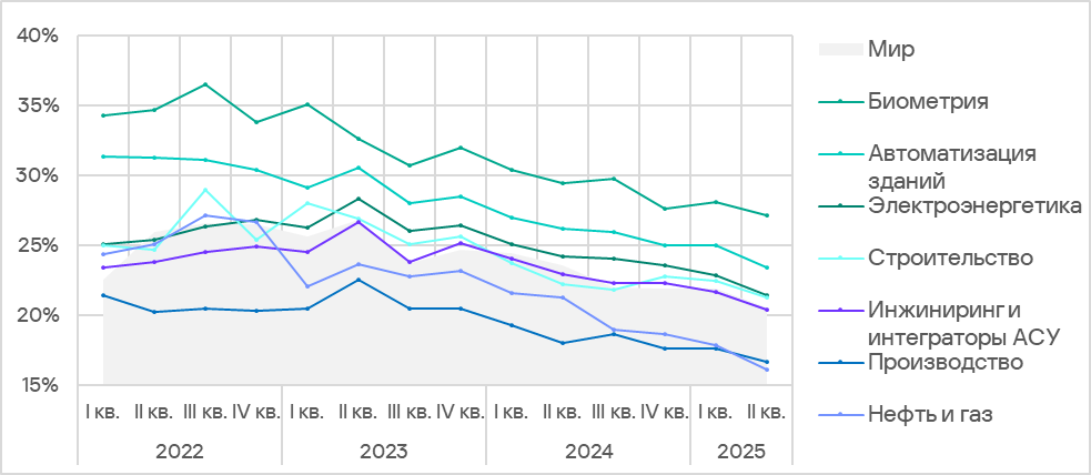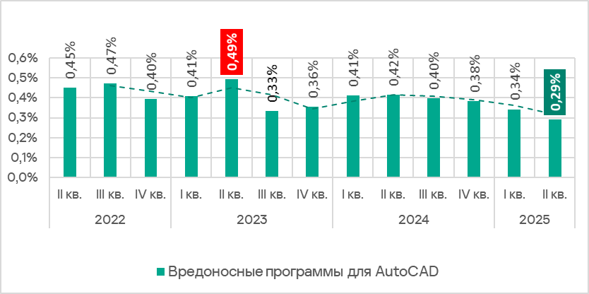 Во втором квартале 2025 года доля компьютеров АСУ, на которых было заблокировано вредоносное ПО для AutoCAD, продолжила снижаться. Показатель был минимальным в период со второго квартала 2022 года.